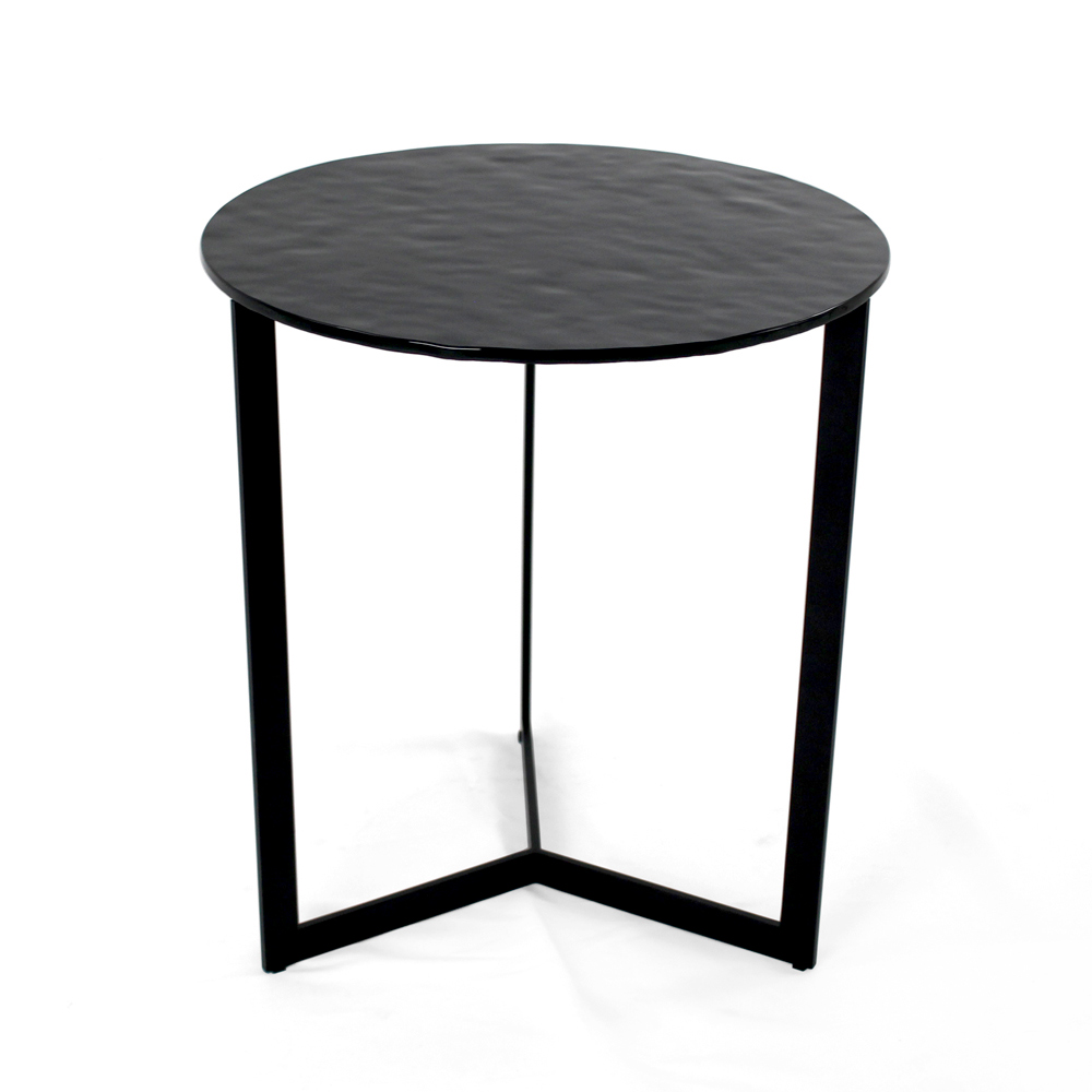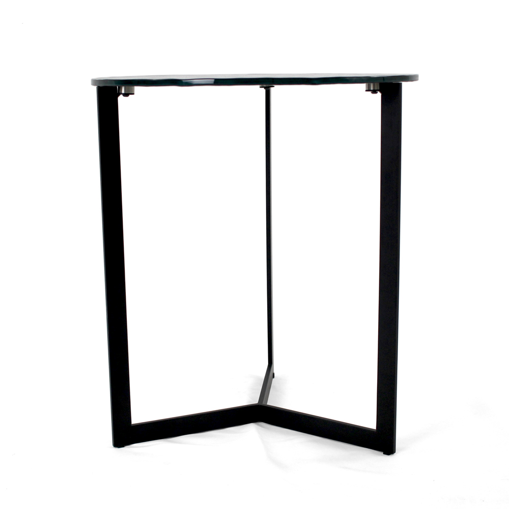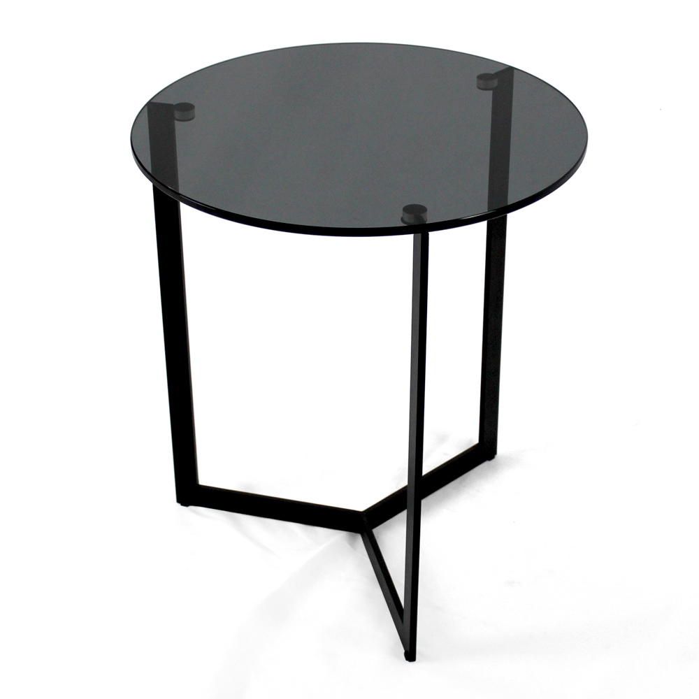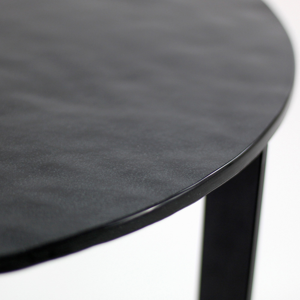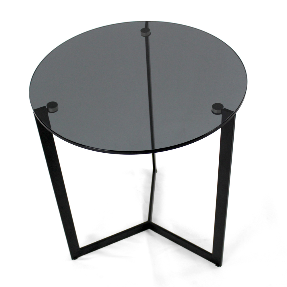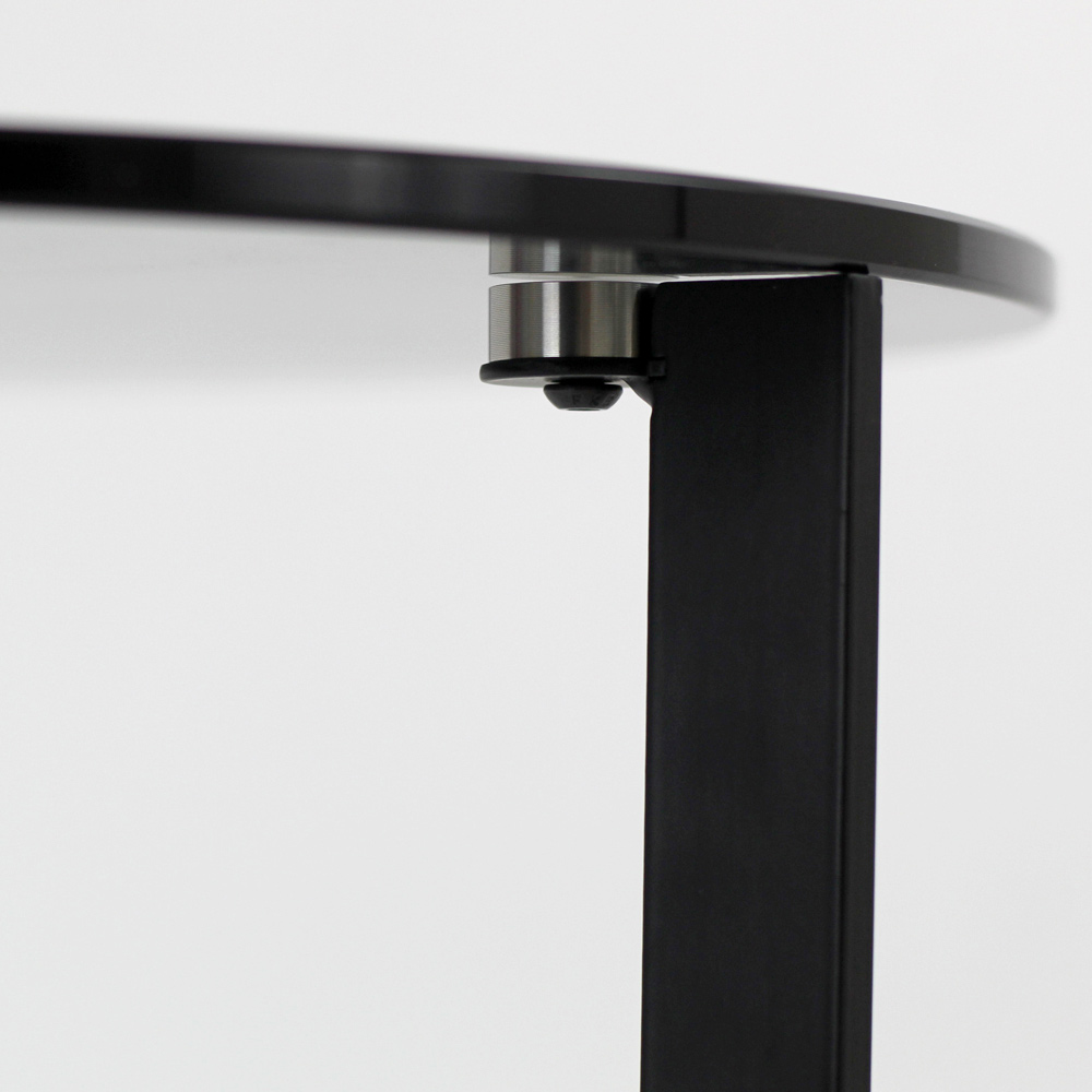 Runder Tisch mit Sockel aus lackiertem Stahl und Glasplatte.