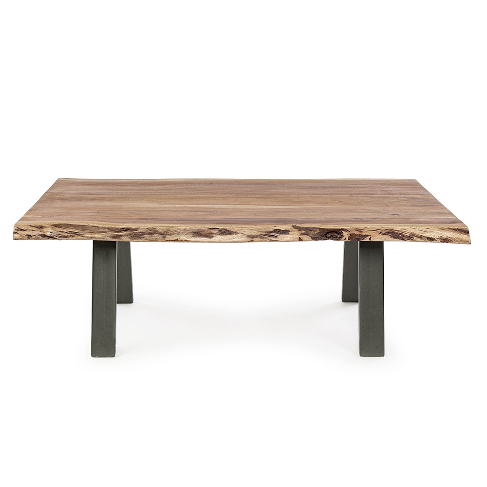Sein eigentliches Hauptmerkmal ist die Akazienholzplatte mit unregelmäßigen Kanten (Living Wood-Effekt), die in Handarbeit mit einem Finish auf Polyurethanlackbasis hergestellt wurde.