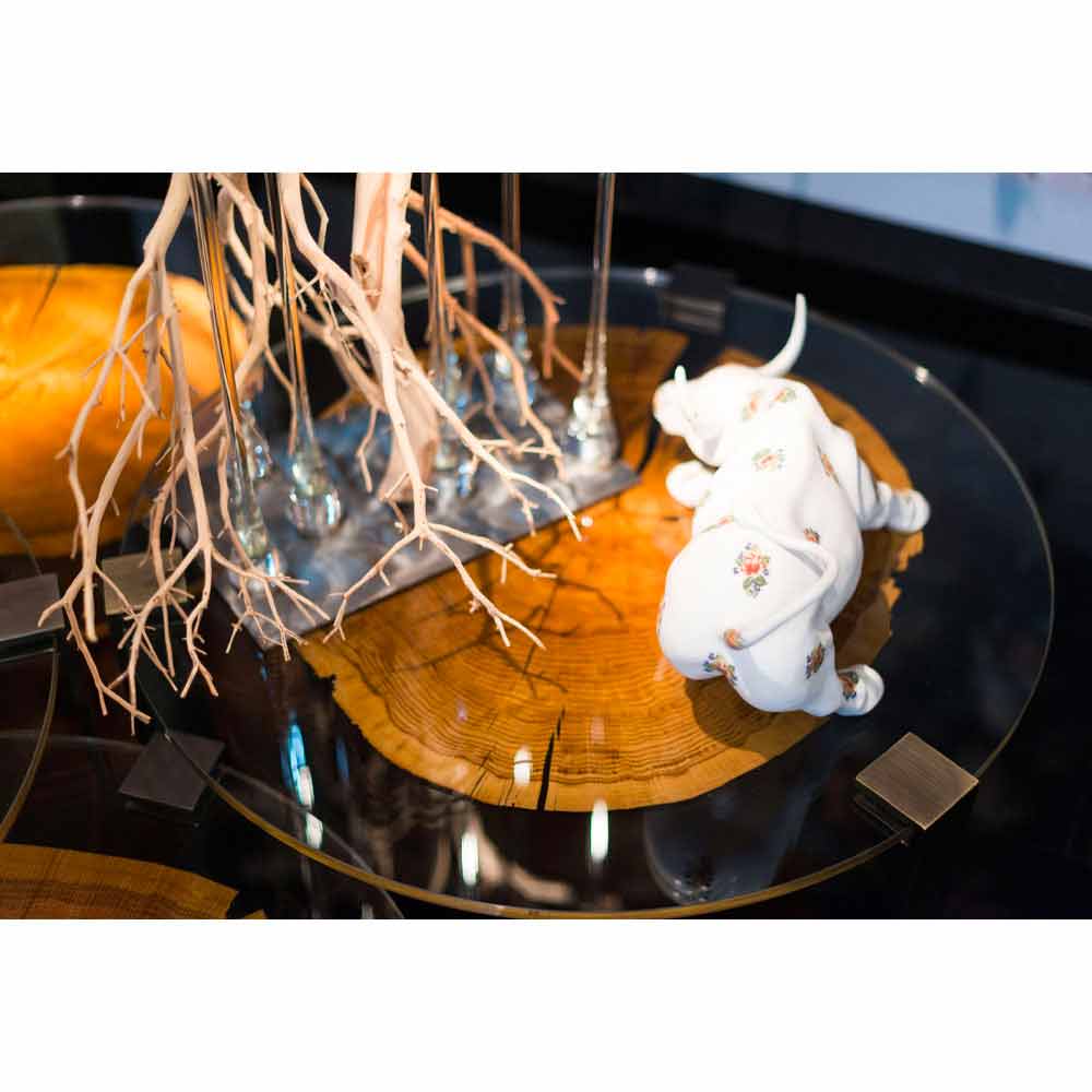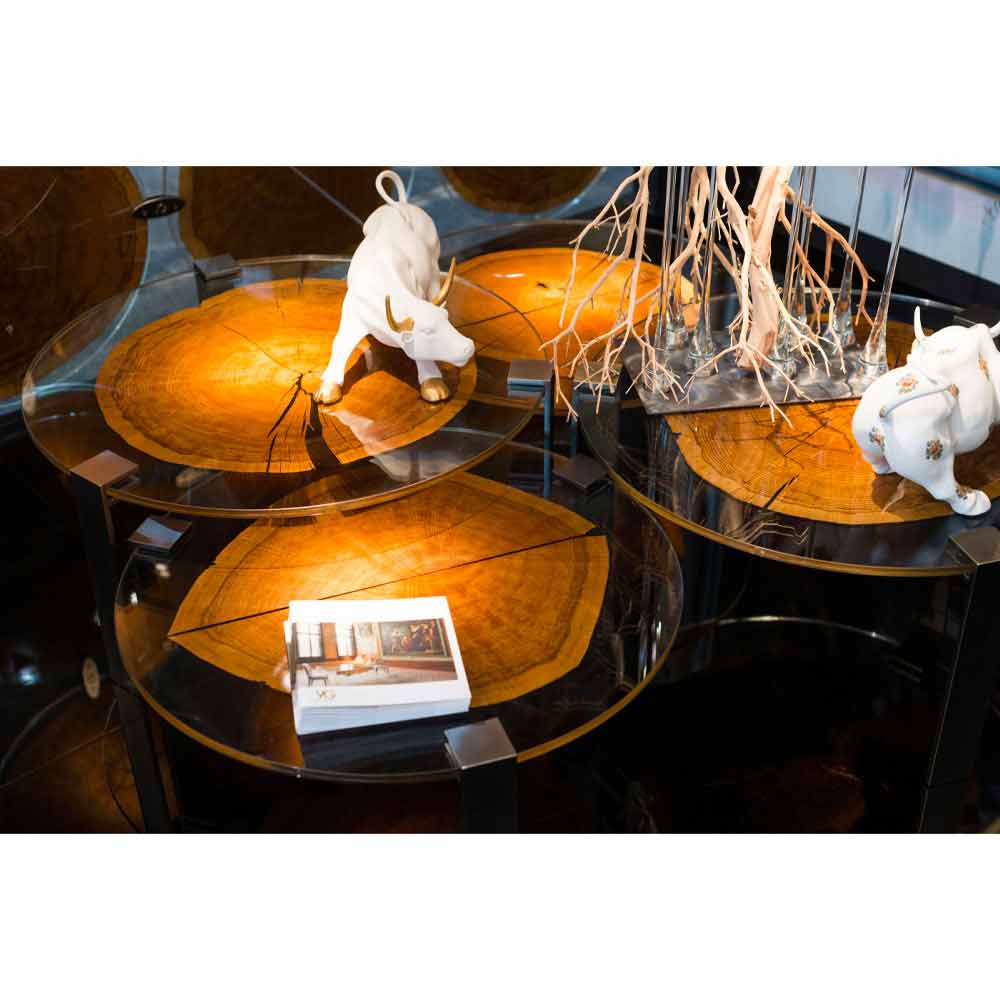 Couchtisch made in Italymit abgerundeter Spitze in gekoppelten Glas (5 + 5 mm) , in dem ein dünnen Schnitt aus Ende- Schnittholz eingesetzt wird, um 3 Metallbeine mit poliertem Messing Ende unterstützt. Aus der exklusiven Kombination des raffinierten Hauchs von Glas, den wundervollen Farben von Holz und der modernen Ästhetik von Metall entsteht eine einzigartige Einrichtungslösung, die ihre Idee auf Konzepte von Innovation und Eleganz für ein avantgardistisches Ergebnis mit starker Persönlichkeit gründet. zeitgenössisch . Seine Stärke liegt in der perfekten Kombination von Oberflächen und Materialien, die den Wert des Couchtisches steigern, ohne jemals den grundlegenden funktionalen Aspekt zu vernachlässigen, der durch die 100% Made in Italy-Verarbeitung und die Verwendung hochwertiger Rohstoffe unterstrichen wird, um ein Einrichtungsaccessoire anzubieten von revolutionärer Schönheit und gleichzeitig besonders solide und widerstandsfähig .