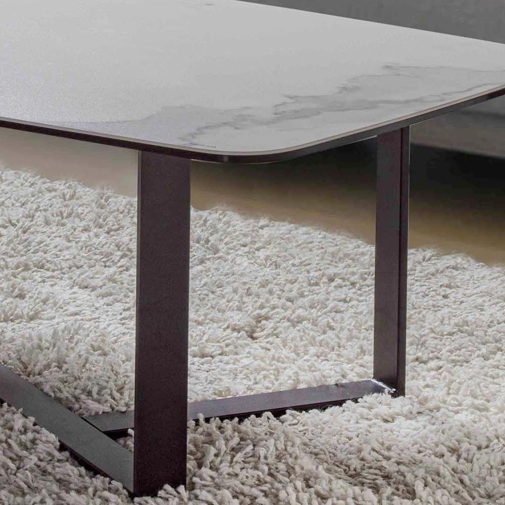 Couchtisch mit Keramikglasplatte in weißem Marmor und schwarz lackiertem Metallfuß . Dieses unverzichtbare und elegante Einrichtungszubehör mit einer diskreten Seele zeichnet sich durch ein Design aus, dessen Idee auf Einfachheit basiert und so ein äußerst vielseitiges Produkt schafft, das sich perfekt an jeden Stil moderner Möbel anpassen lässt. Aufgrund seiner Struktur und Abmessungen ist es die perfekte Wahl, um die Hauptauflagefläche in der Mitte Ihres Wohnzimmers darzustellen, die als praktische Auflagefläche für Getränke, Bücher, Zeitschriften oder andere Gegenstände dient, die Sie in Reichweite halten möchten. von Hand und gleichzeitig als raffiniertes dekoratives Element.
