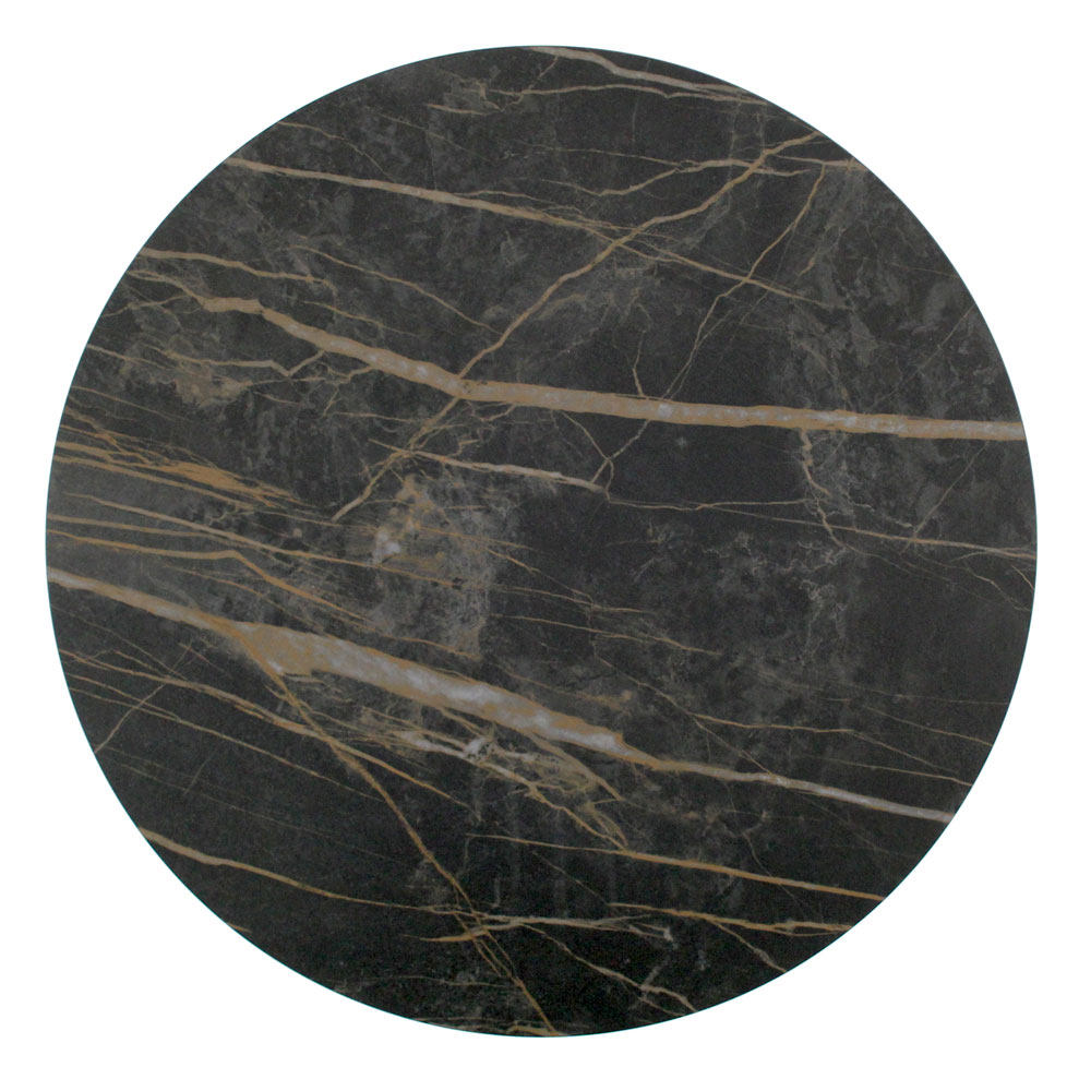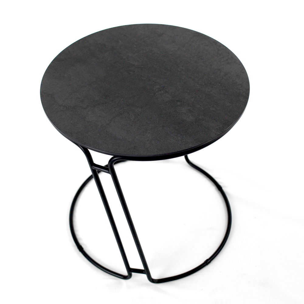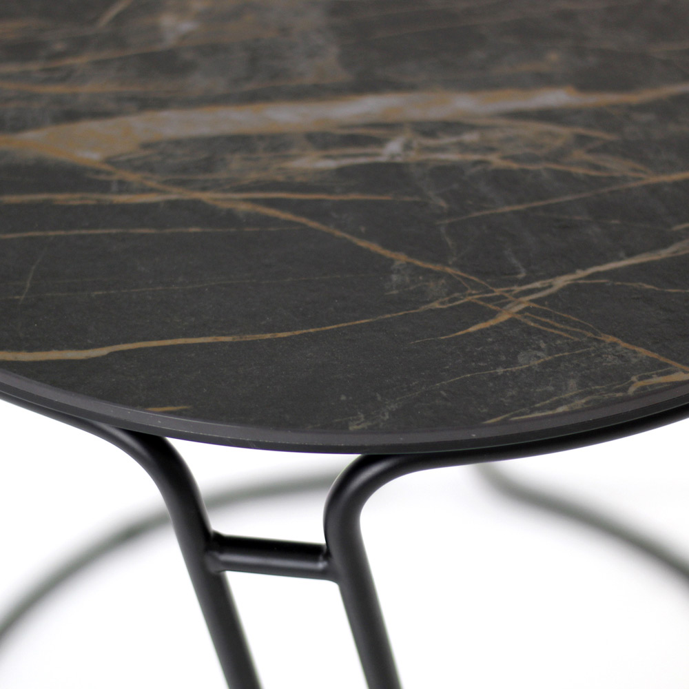 Runder Couchtisch mit lackiertem Stahlsockel und Platte aus Feinsteinzeug.