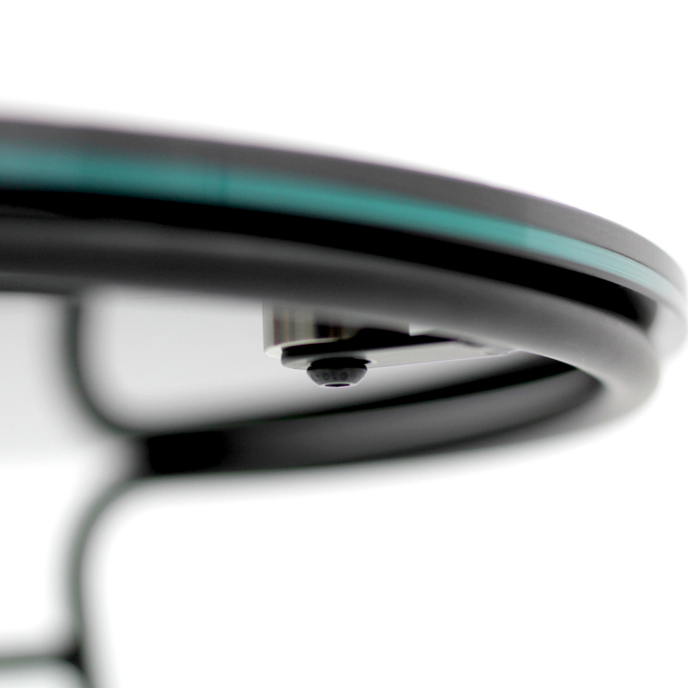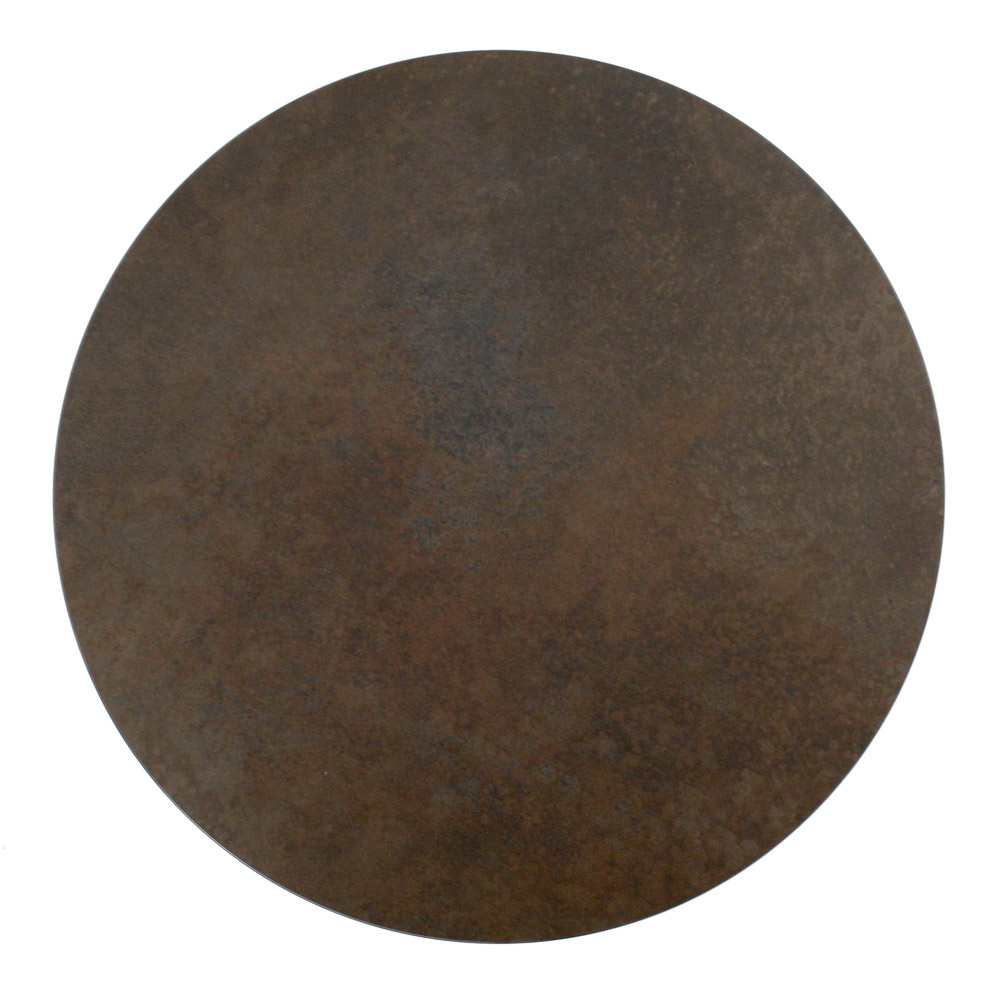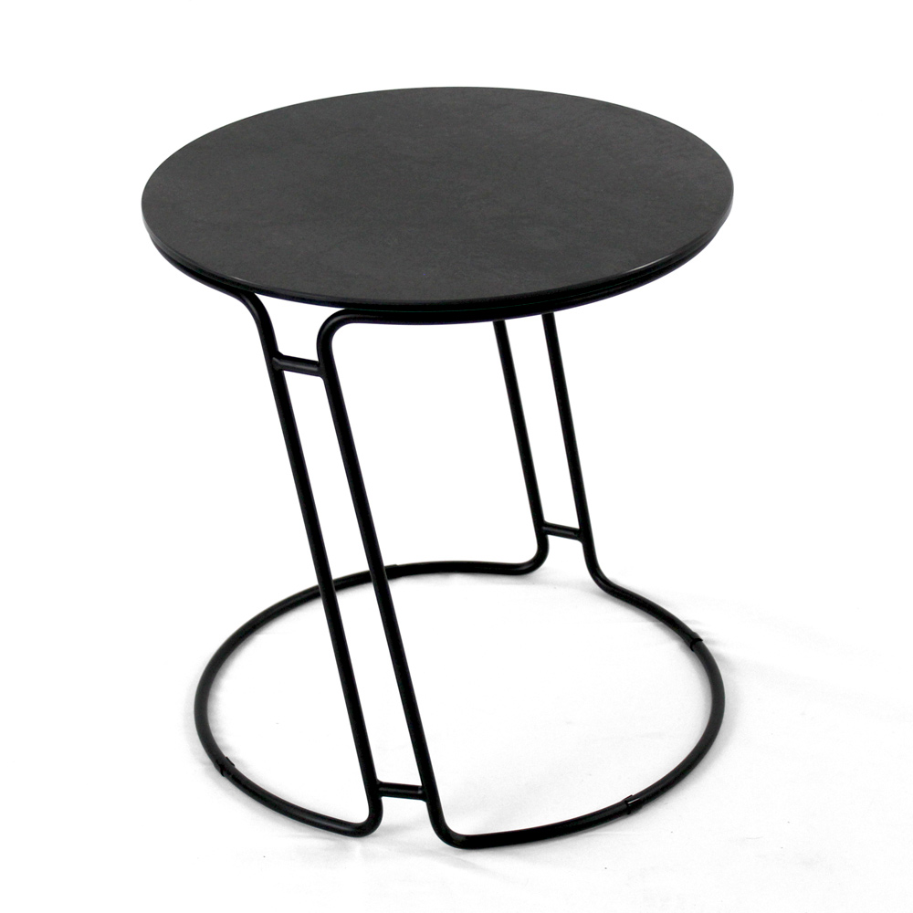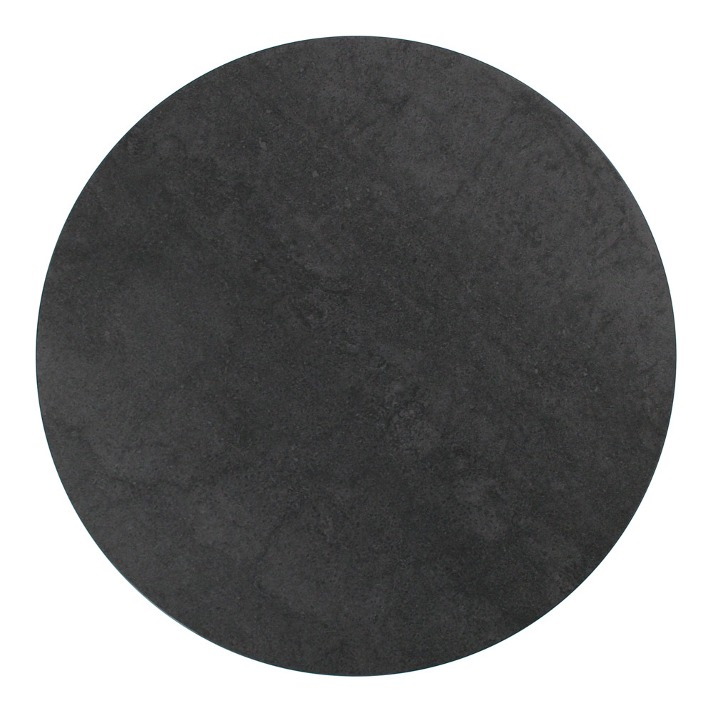 Runder Couchtisch mit lackiertem Stahlsockel und Platte aus Feinsteinzeug.