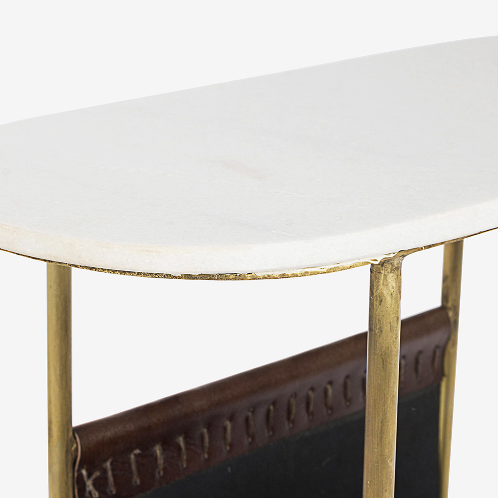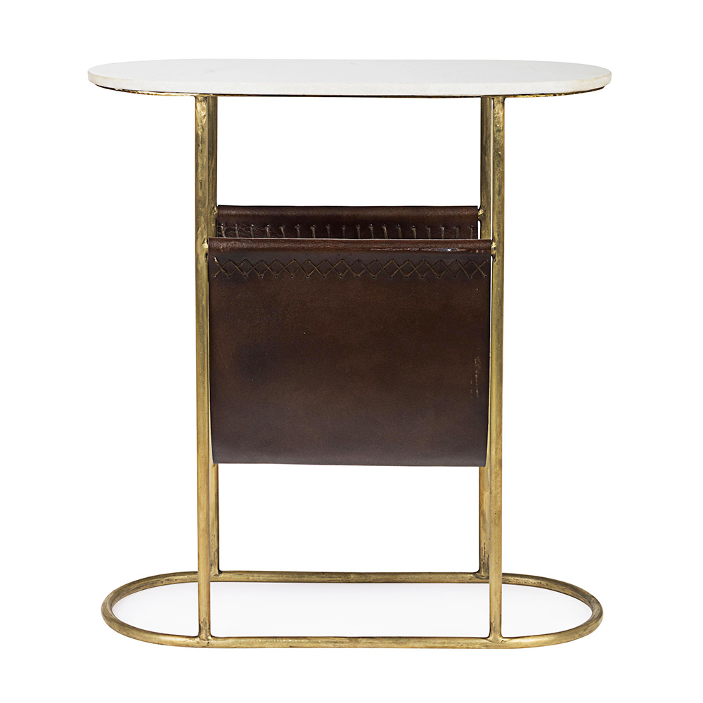 Couchtisch aus vermessingtem Stahl und Marmorplatte mit Zeitungsständer aus Leder.