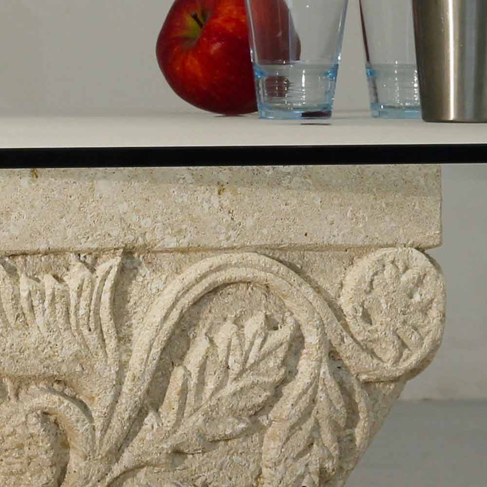 Die Basis ist aus Naturstein aus Vicenza hergestellt und wird von Hand bearbeitet. Die Tischplatte besteht aus Kristall float mit einer Dicke von 12 mm und ist an dem Stein mit einem Flansch befestigt.