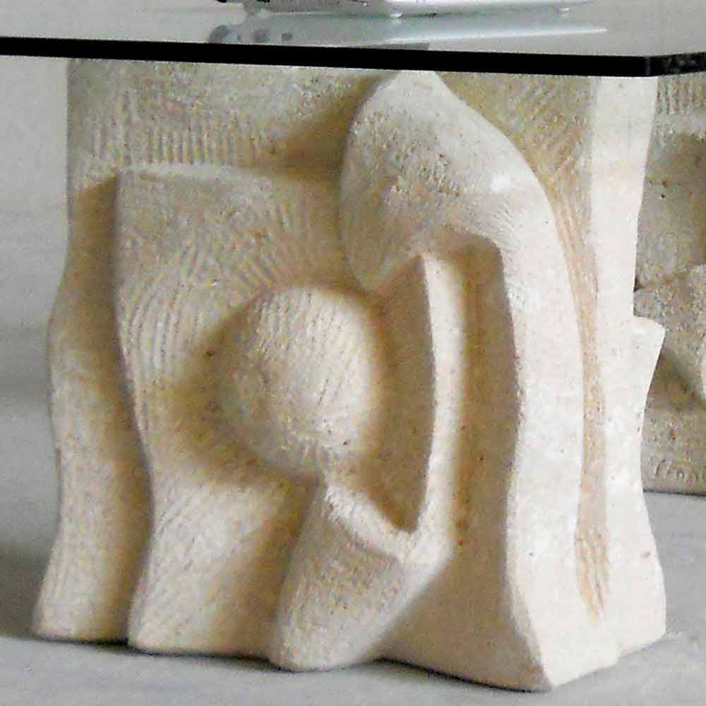 Die Basis ist aus Naturstein aus Vicenza hergestellt und wird von Hand bearbeitet. Die Tischplatte besteht aus Kristall float mit einer Dicke von 12 mm und ist an dem Stein mit einem Flansch befestigt.