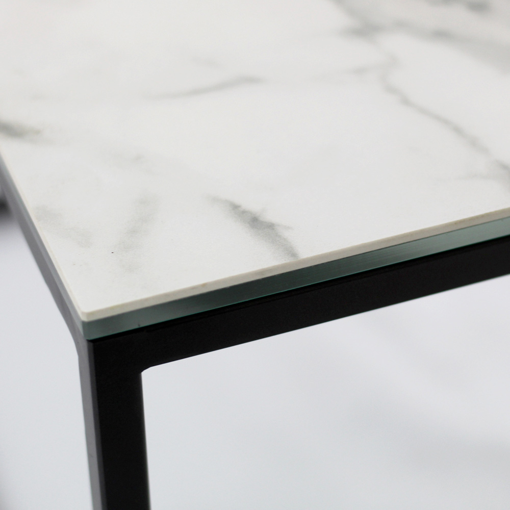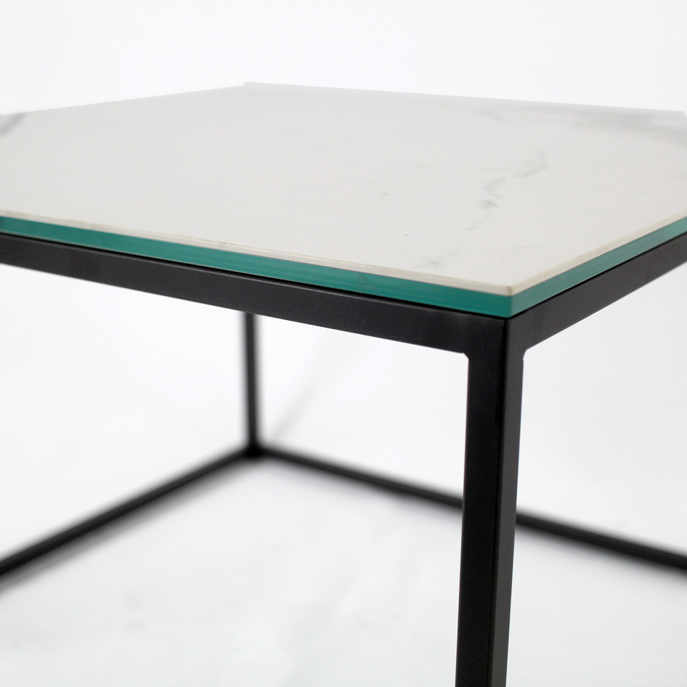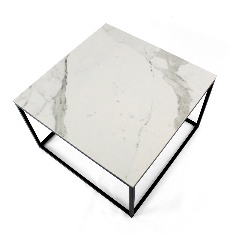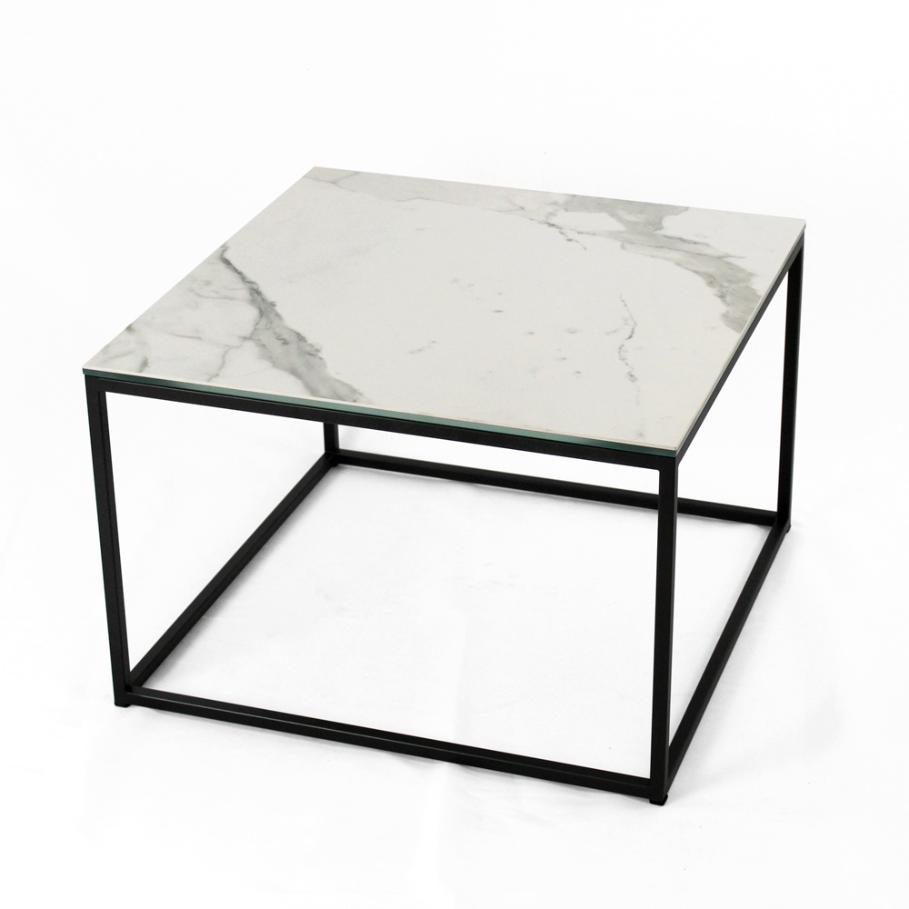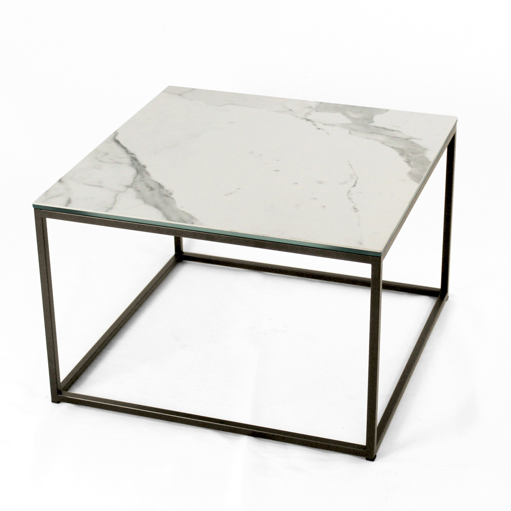 Quadratischer Couchtisch mit lackiertem Stahlsockel und Tischplatte aus 3 mm dickem, matt geädertem Steinzeug in Statuenweiß, laminiert mit 6 mm dickem Floatglas. Die Couchtische im modernen Stil stellen das perfekte Möbelstück dar, um die Dekoration jedes Wohn- und Wohnzimmers zu vervollständigen. Diese Produkte sind einzigartig, elegant und funktional zugleich, dank ihrer einfachen und harmonischen Verarbeitung, die sie für jeden Bedarf und Anlass geeignet macht. Die für die Konstruktion verwendeten Materialien garantieren auch im Laufe der Zeit eine hohe Qualität und Widerstandsfähigkeit.