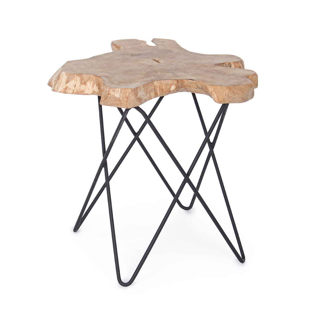 Dieser Wohnzimmer-Couchtisch besteht aus einem Boden aus Teakholzwurzeln mit einem natürlichen Finish Und Beine aus epoxidpulverbeschichtetem Stahl.