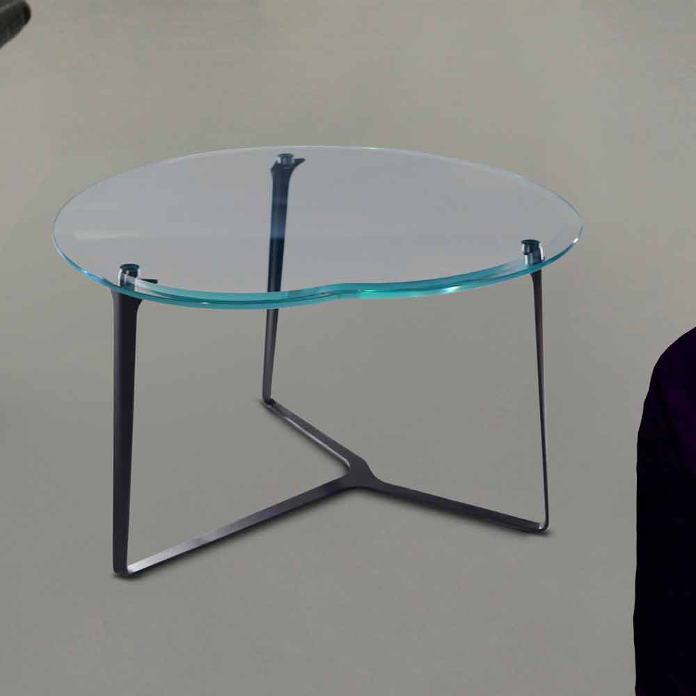 Seine Ästhetik wird durch die Wahl unterstrichen, kreative Formen sowohl für die Oberseite als auch für die Basis zu verwenden, wodurch dem Produkt eine originelle und völlig revolutionäre Persönlichkeit verliehen wird. Die dünnen und empfindlichen Linien der Stahlkonstruktion folgen unregelmäßigen Linien, die so unvorhersehbar sind wie Wasserströme und eine feste Stütze für den Tisch darstellen. Die Oberseite ist zart darauf platziert, sehr rein und ultraklar, deren Brillanz an die eines echten kostbaren Diamanten erinnert, auf dem das Licht gleitet und wundervolle Kontrastspiele erzeugt. Aus der Begegnung zwischen der zeitlosen Eleganz von Glas und der inhärenten Modernität von Stahl entsteht eine Einrichtungslösung mit einer raffinierten Seele, die sich ideal dazu eignet, Ihre Räume mit einem Hauch kreativen Stils zu vervollständigen und zu verschönern.