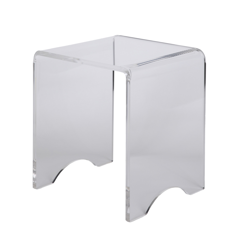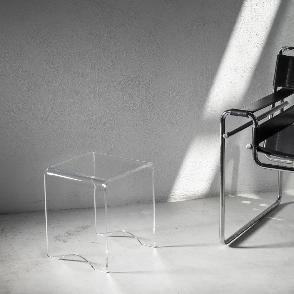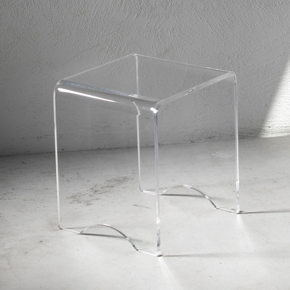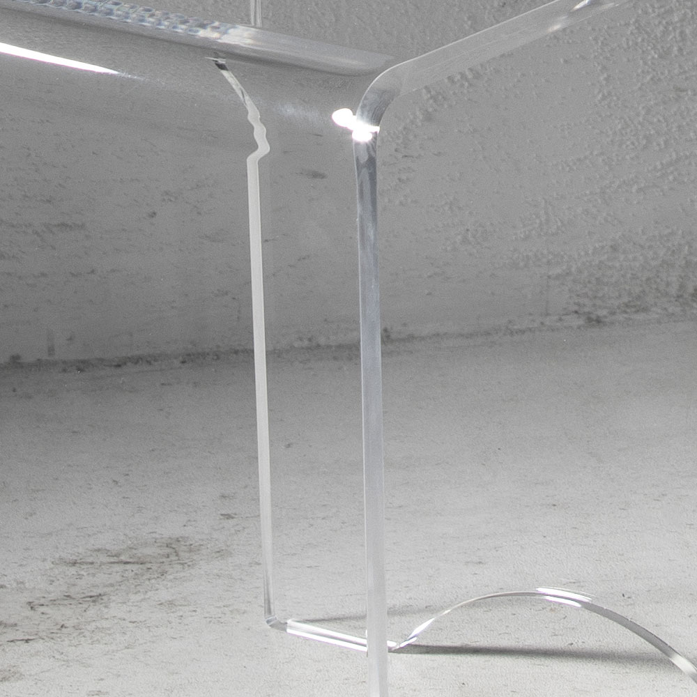 Dieser Couchtischhocker hat ein vielseitiges Design mit reinen und minimalen Linien und besteht vollständig aus transparentem Acrylkristall , der entlang des gesamten Umfangs lasergeschnitten ist, was ihm eine außergewöhnliche Brillanz verleiht.