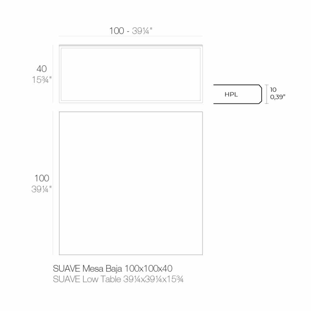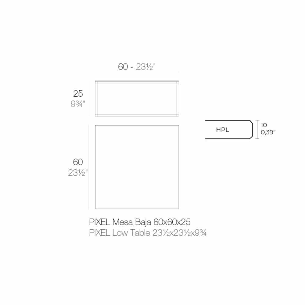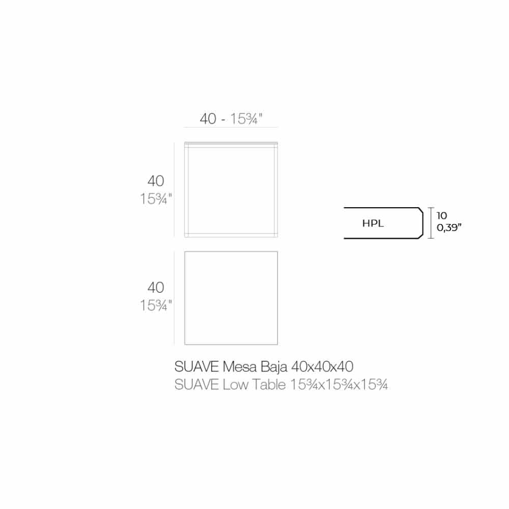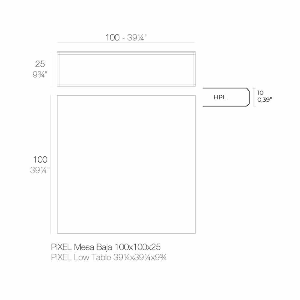 Quadratischer Couchtisch für die Gartenlounge in Aluminium und schwarzer HPL-Platte, 4 Größen und 2 Höhen.