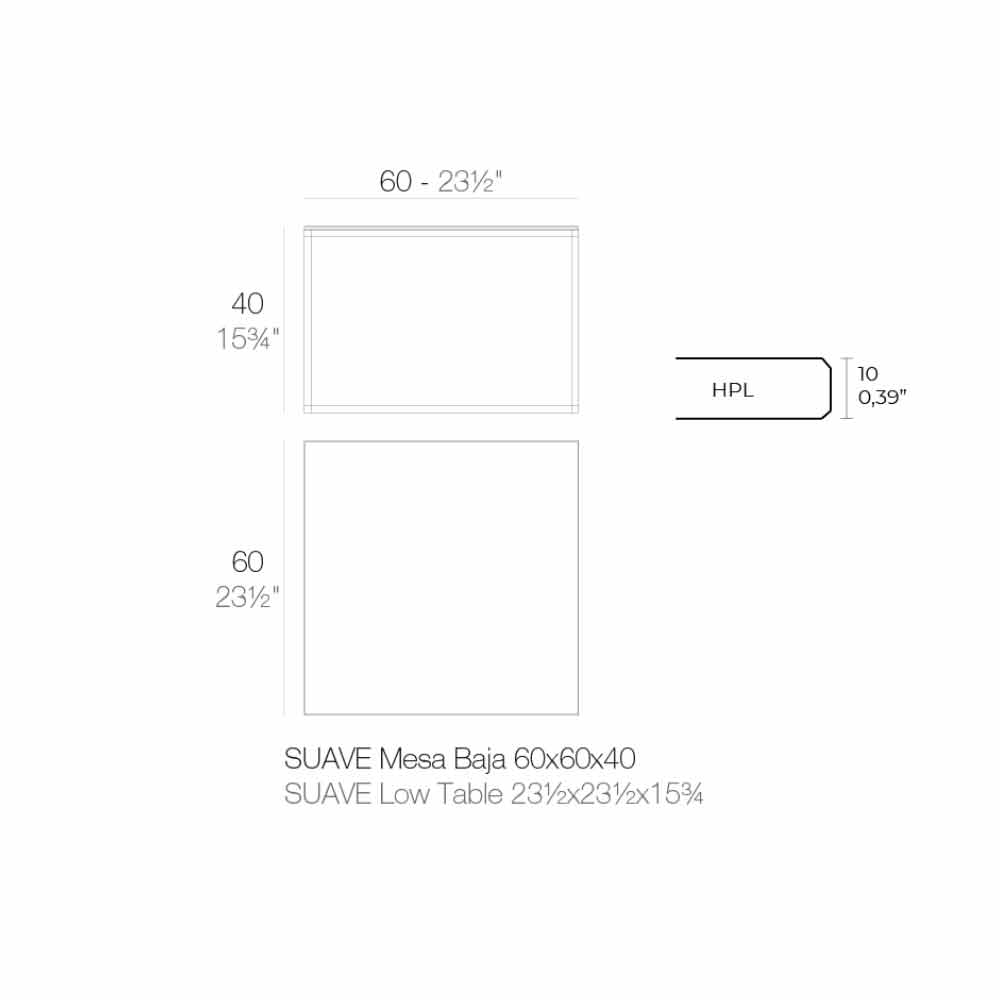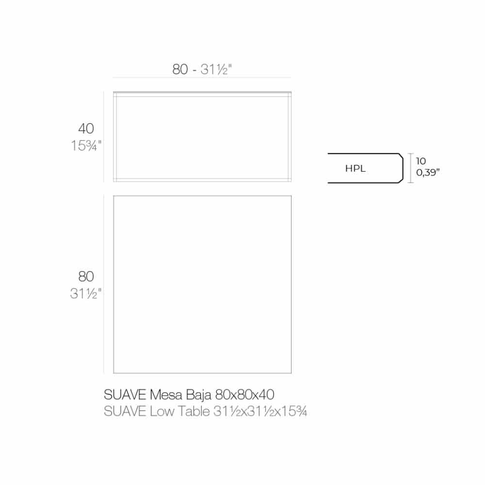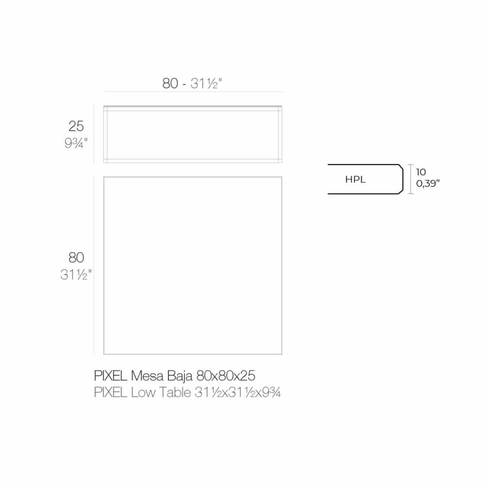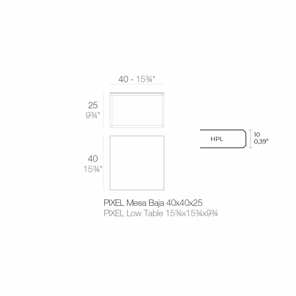 Quadratischer Couchtisch für die Gartenlounge in Aluminium und schwarzer HPL-Platte, 4 Größen und 2 Höhen.