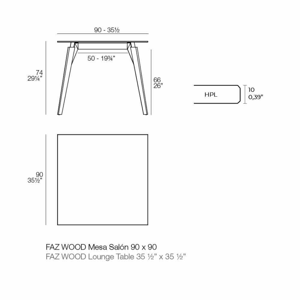 Couchtisch mit Beinen aus hellem oder dunklem Eschenholz und HPL-Platte in verschiedenen Ausführungen und 2 quadratischen Größen.
