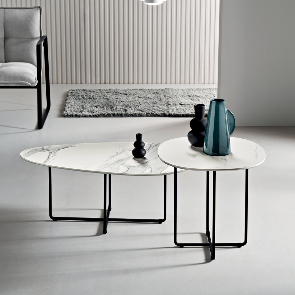 Die Tischplatte ist wahlweise aus Spiegelglas , das den Raum heller wirken lässt, oder aus einer mit Marmoroptik versehenen Keramikschicht auf Glas erhältlich – eine Lösung, die Langlebigkeit und ästhetische Eleganz vereint. Dank dieser zwei Optionen können Sie den Tisch individuell an den Stil Ihres Zimmers anpassen.