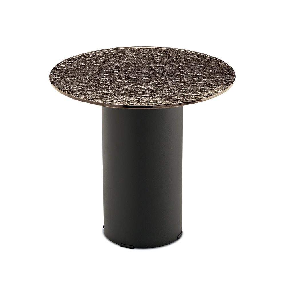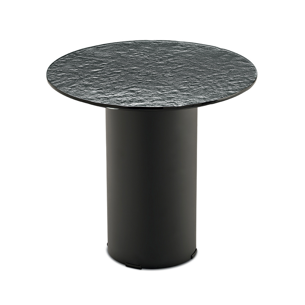 Die Konstruktion zeichnet sich durch einen zylindrischen, lackierten Metallsockel aus, der massiv und dennoch optisch leicht wirkt und die obere Einheit ausbalanciert. Dieser Kontrast zwischen massiven Formen und dünnen Oberflächen erzeugt eine moderne und elegante Ästhetik, die sich perfekt für anspruchsvolle Räume eignet.