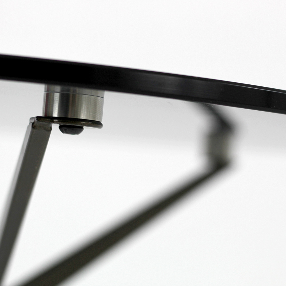 Runder Couchtisch mit lackiertem Stahlsockel und Glasplatte.