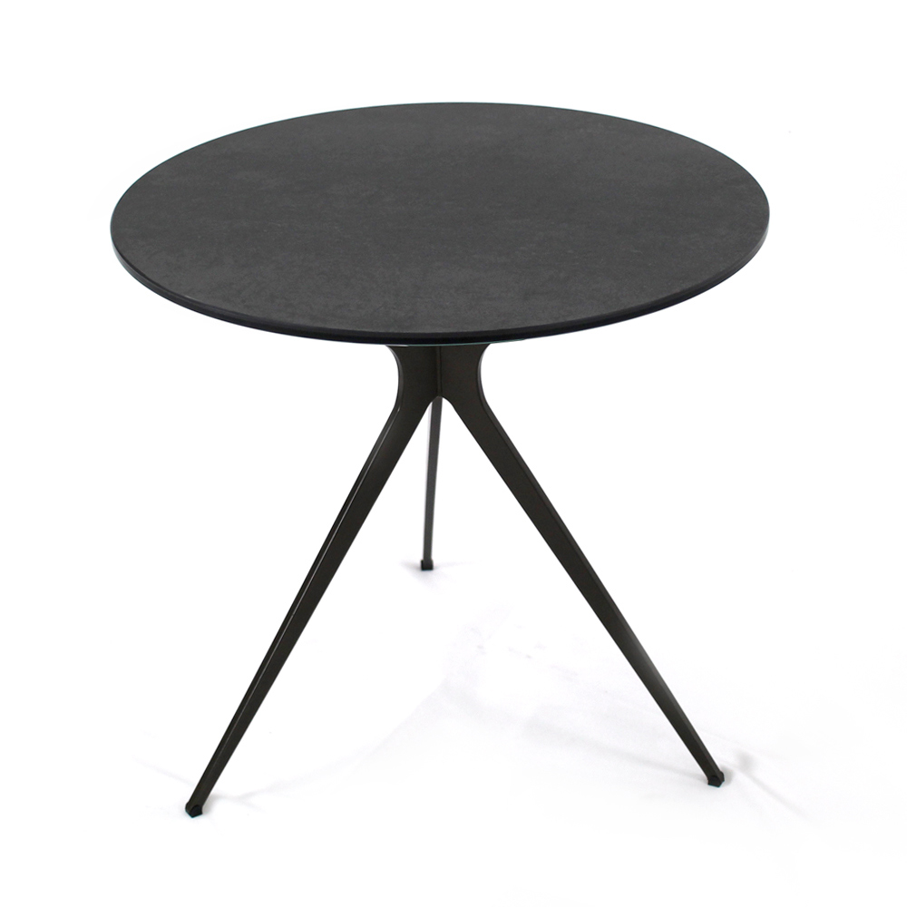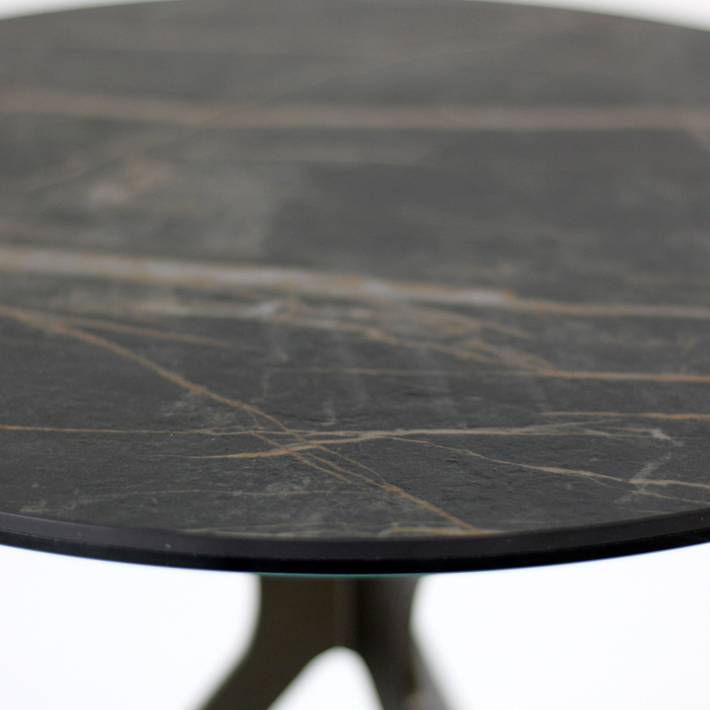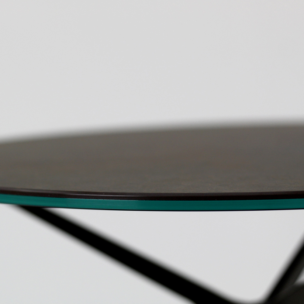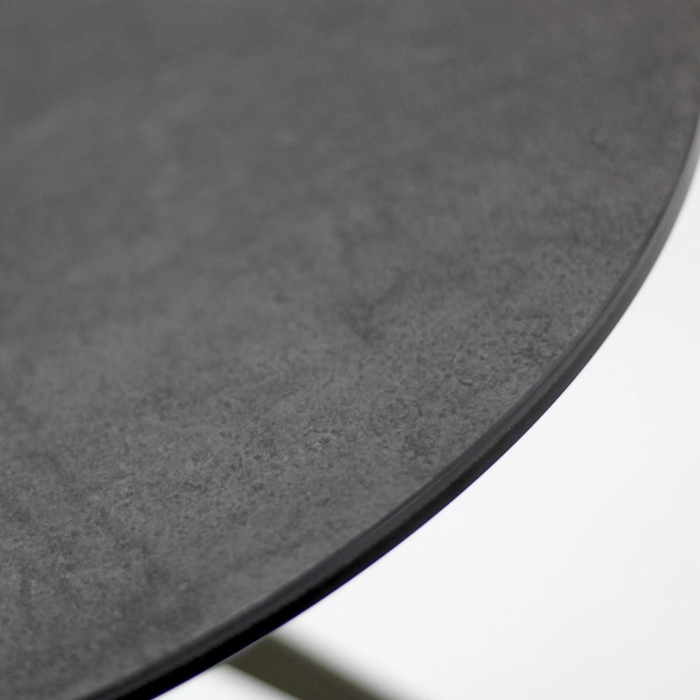 Runder Couchtisch mit lackiertem Stahlsockel und Platte aus Feinsteinzeug.