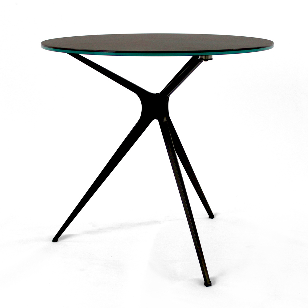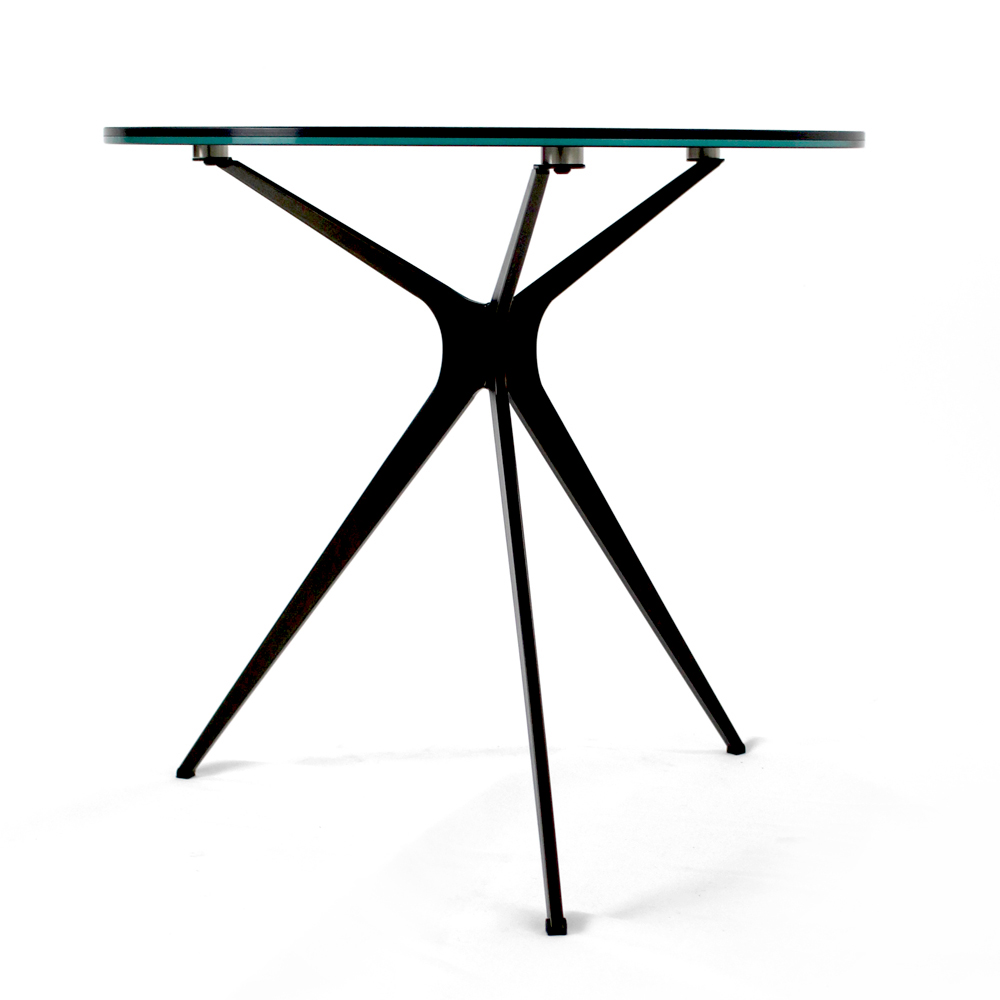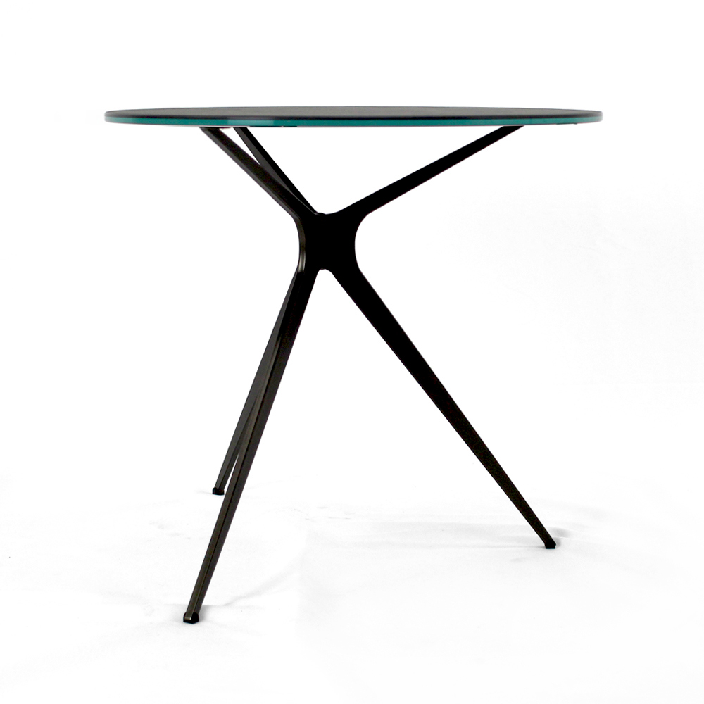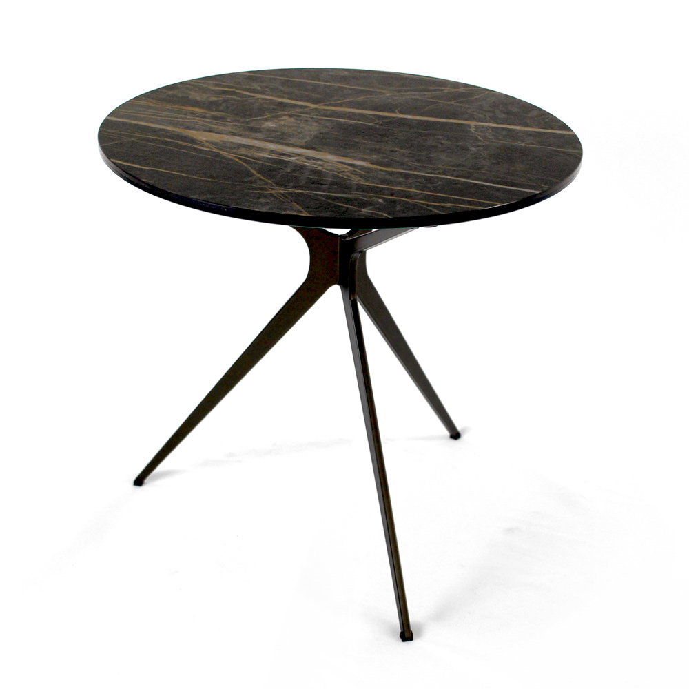 Runder Couchtisch mit lackiertem Stahlsockel und Platte aus Feinsteinzeug.