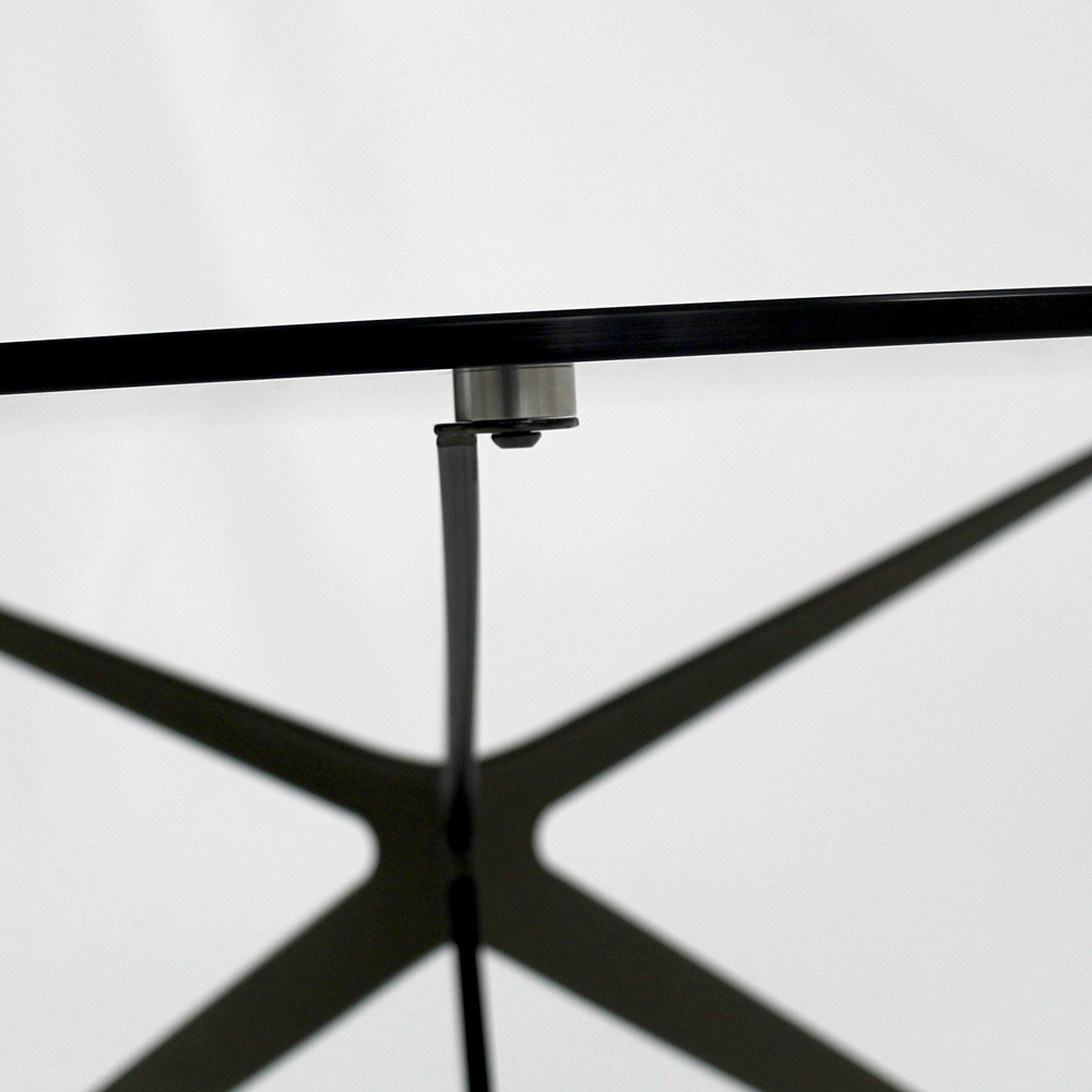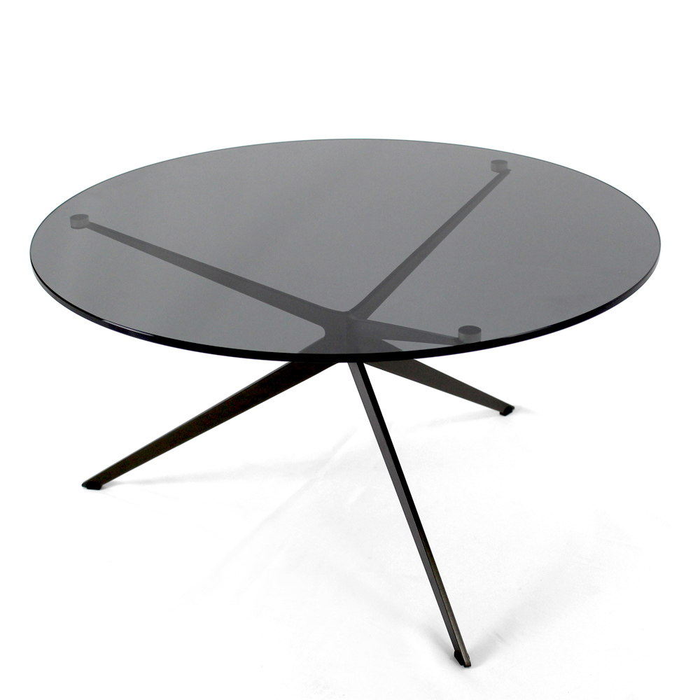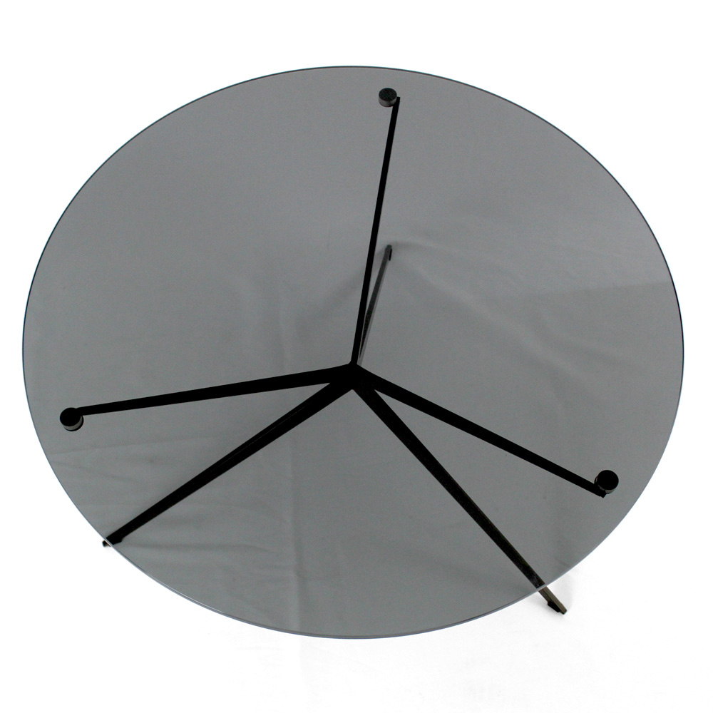 Runder Couchtisch mit lackiertem Stahlsockel und Glasplatte.