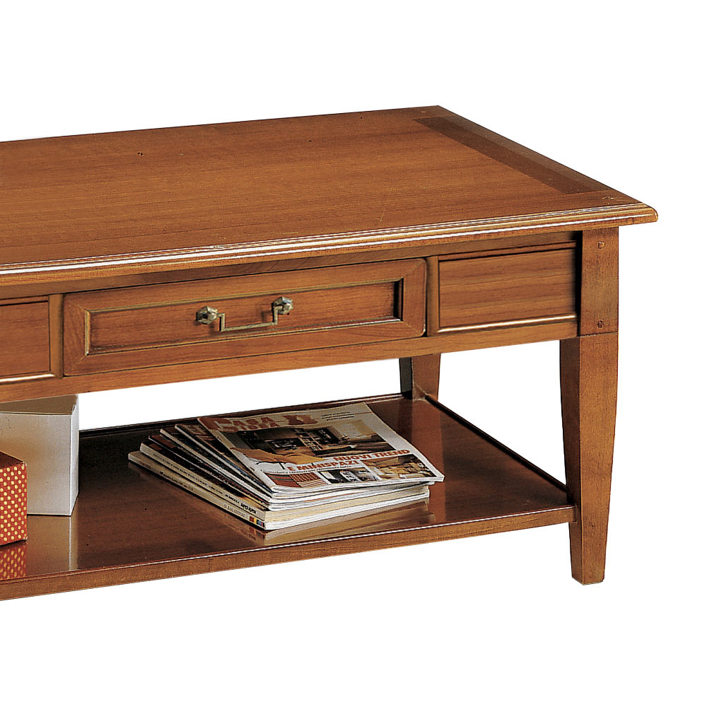 Couchtisch für den Innenbereich mit Massivholzrahmen , Toulipier-Rahmen, Paneelen und anderen Teilen aus Kirschbaum- und/oder Tanganjika-Furnierholz, Holzpartikeln mit 1 Schublade und unterer Ablage, vollständig in Italien hergestellt.