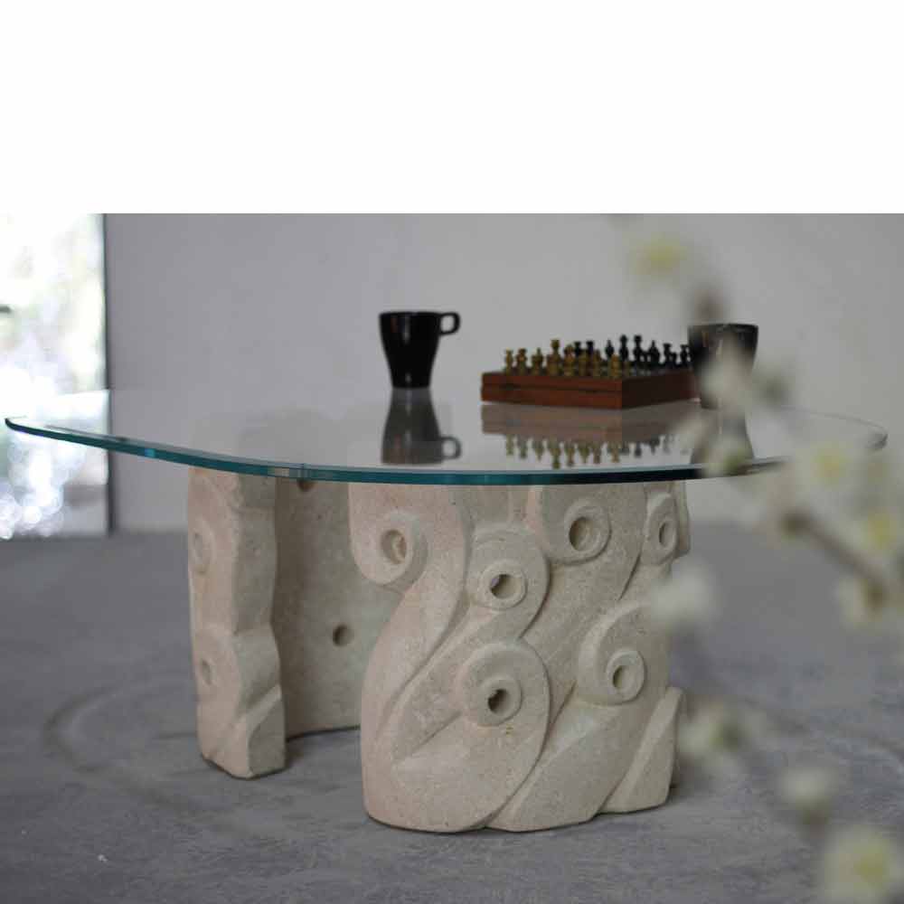 Die Basis ist aus Naturstein aus Vicenza hergestellt und wird von Hand bearbeitet. Die Tischplatte besteht aus Kristall float mit einer Dicke von 12 mm und ist an dem Stein mit einem Flansch befestigt.