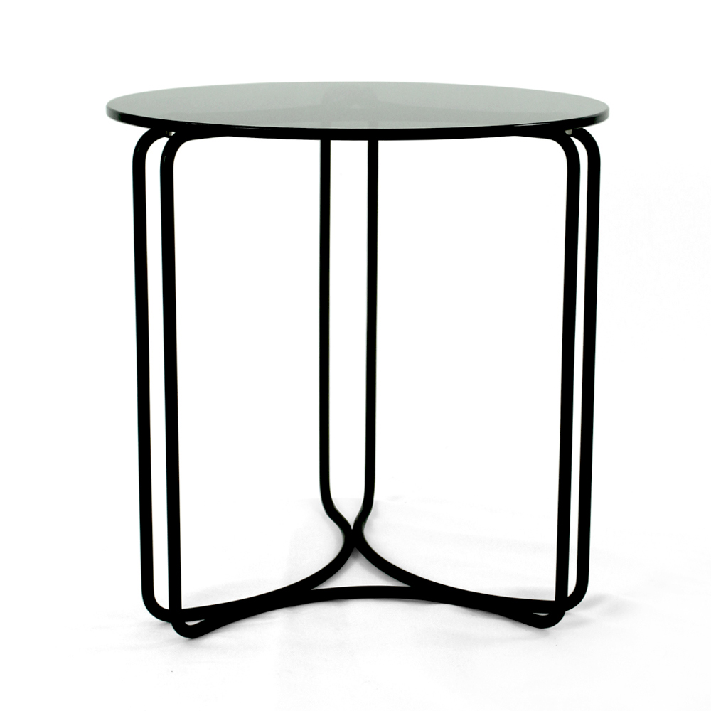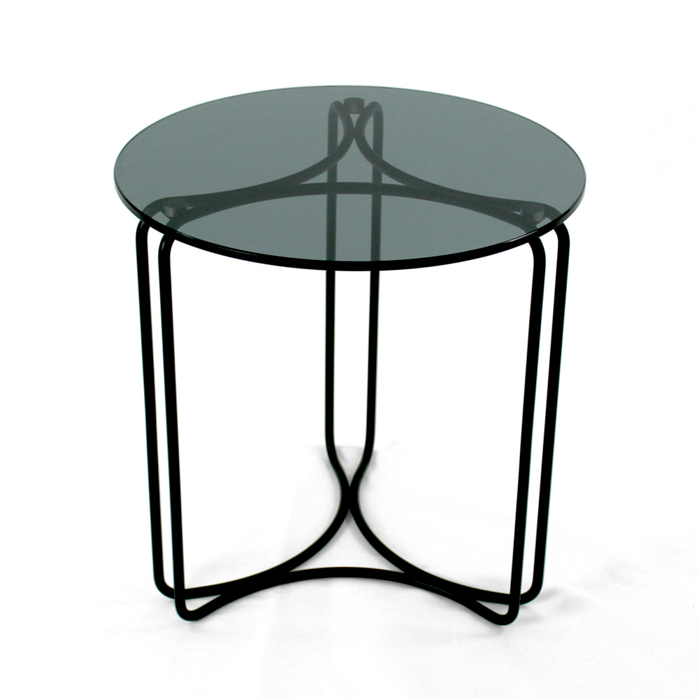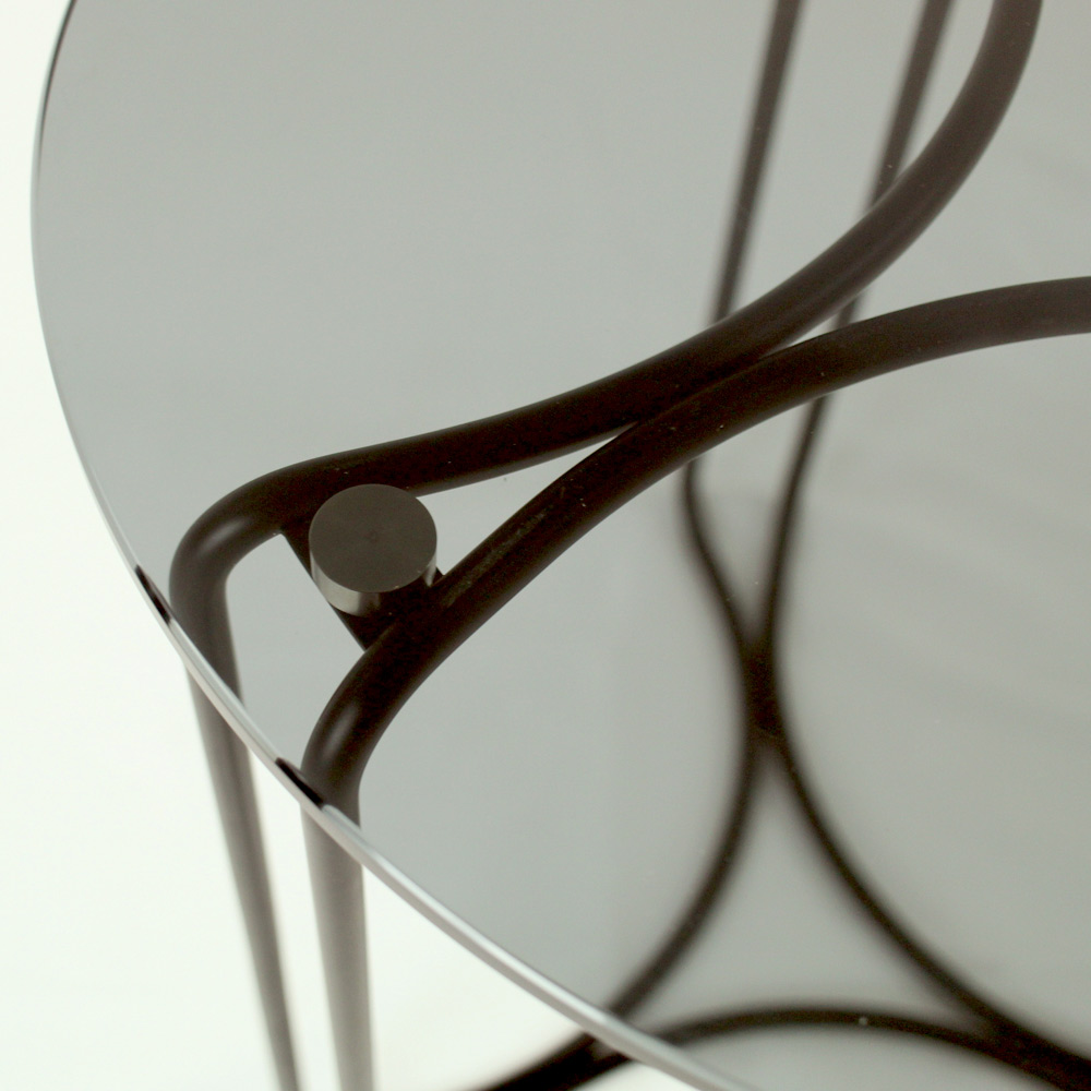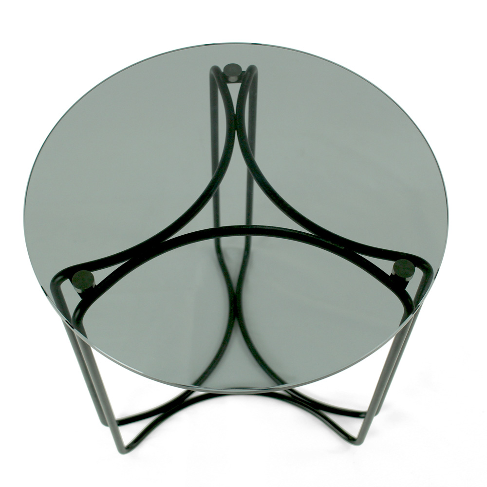 Runder Couchtisch mit lackiertem Stahlsockel und Glasplatte.