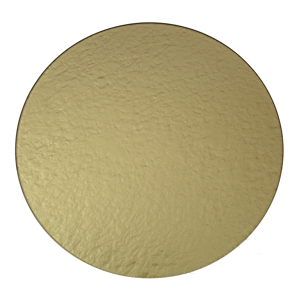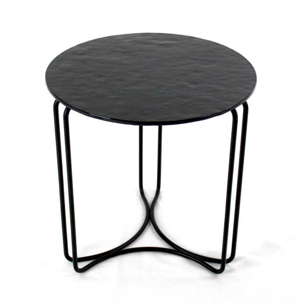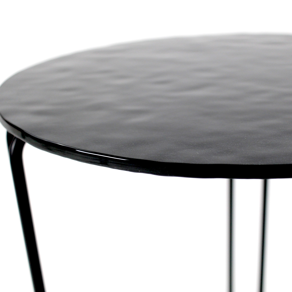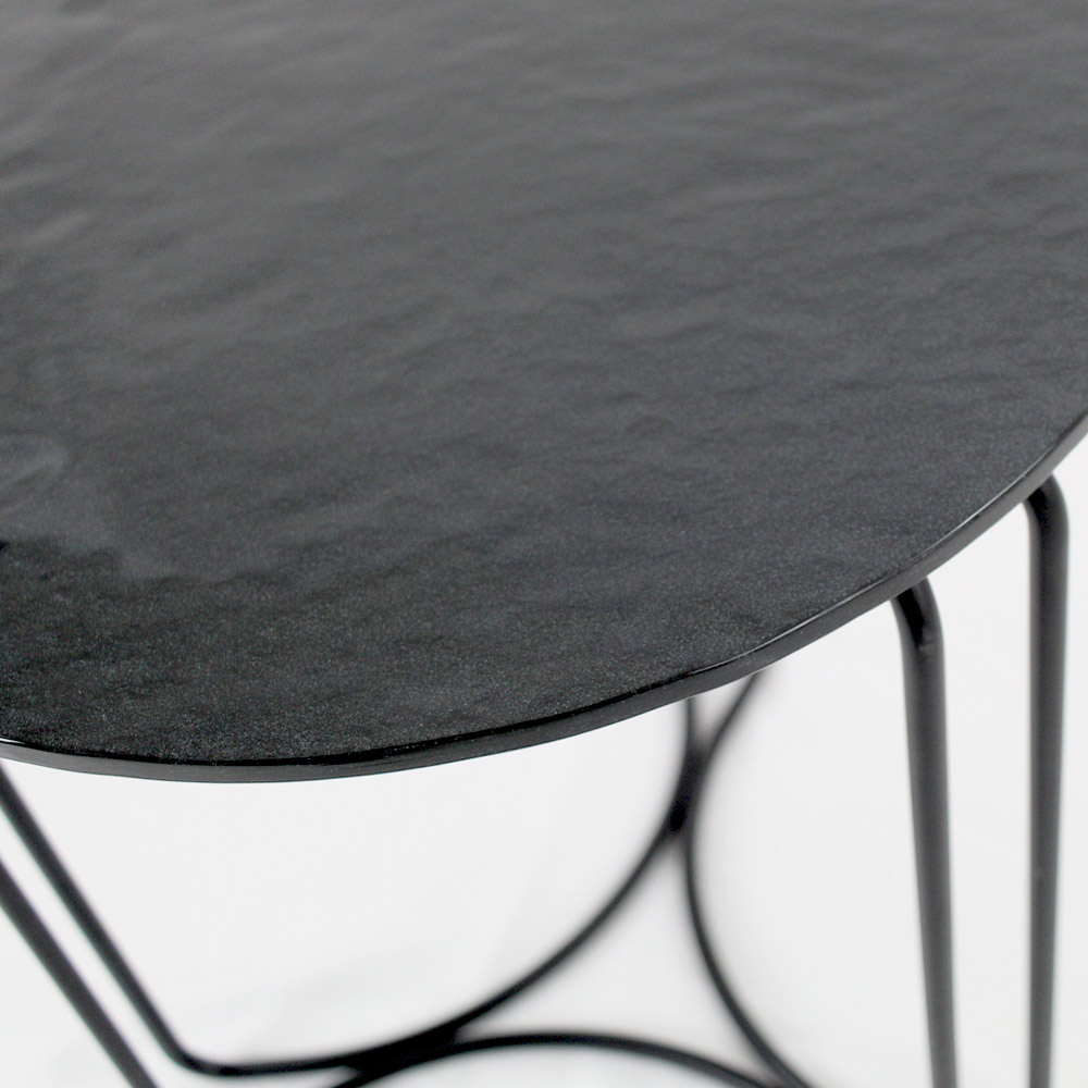 Runder Couchtisch mit lackiertem Stahlsockel und Glasplatte.