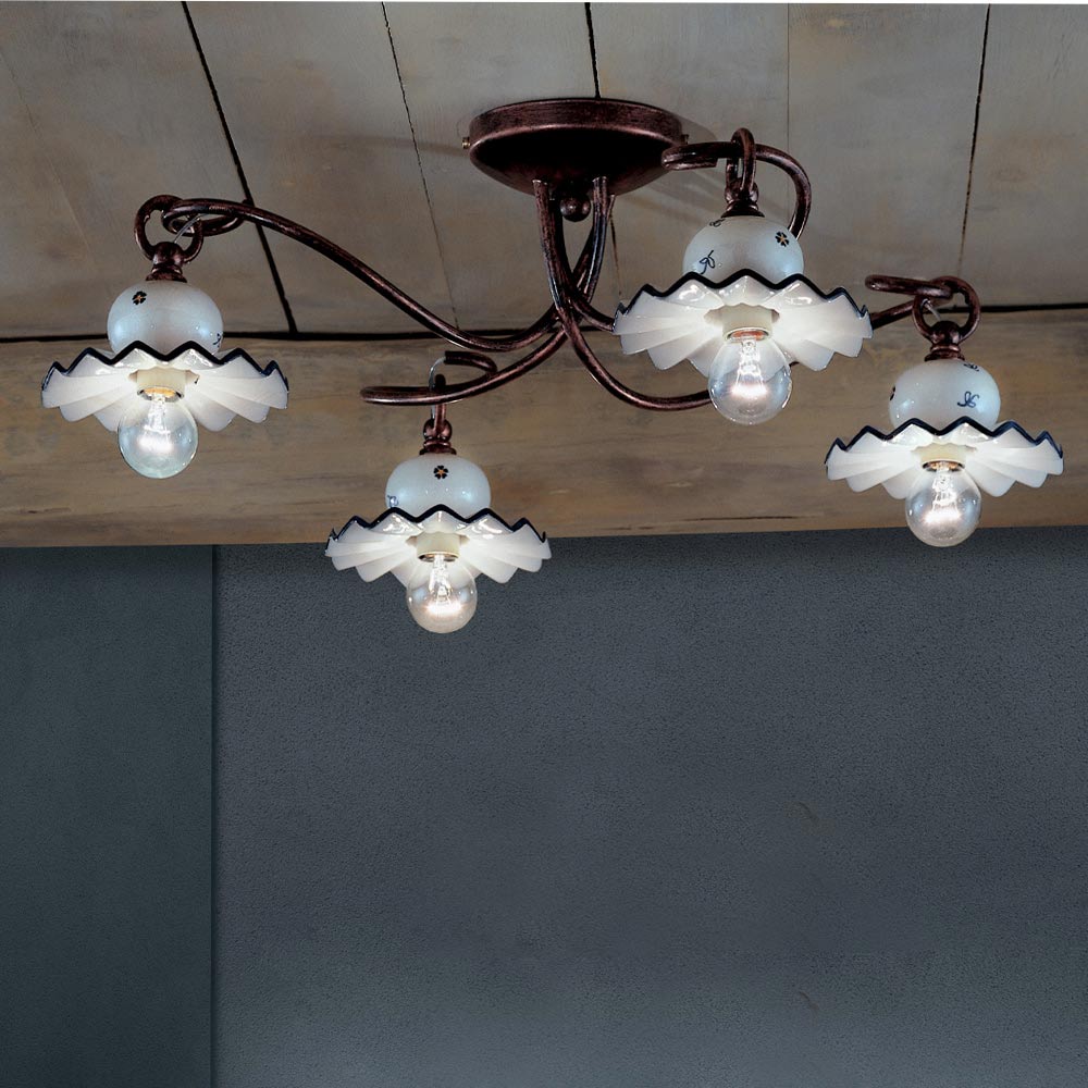 Handgefertigte Deckenlampe mit 3 oder 4 Lichtern aus Metall und handbemalter Keramik, hergestellt in Italien von Ferroluce.
