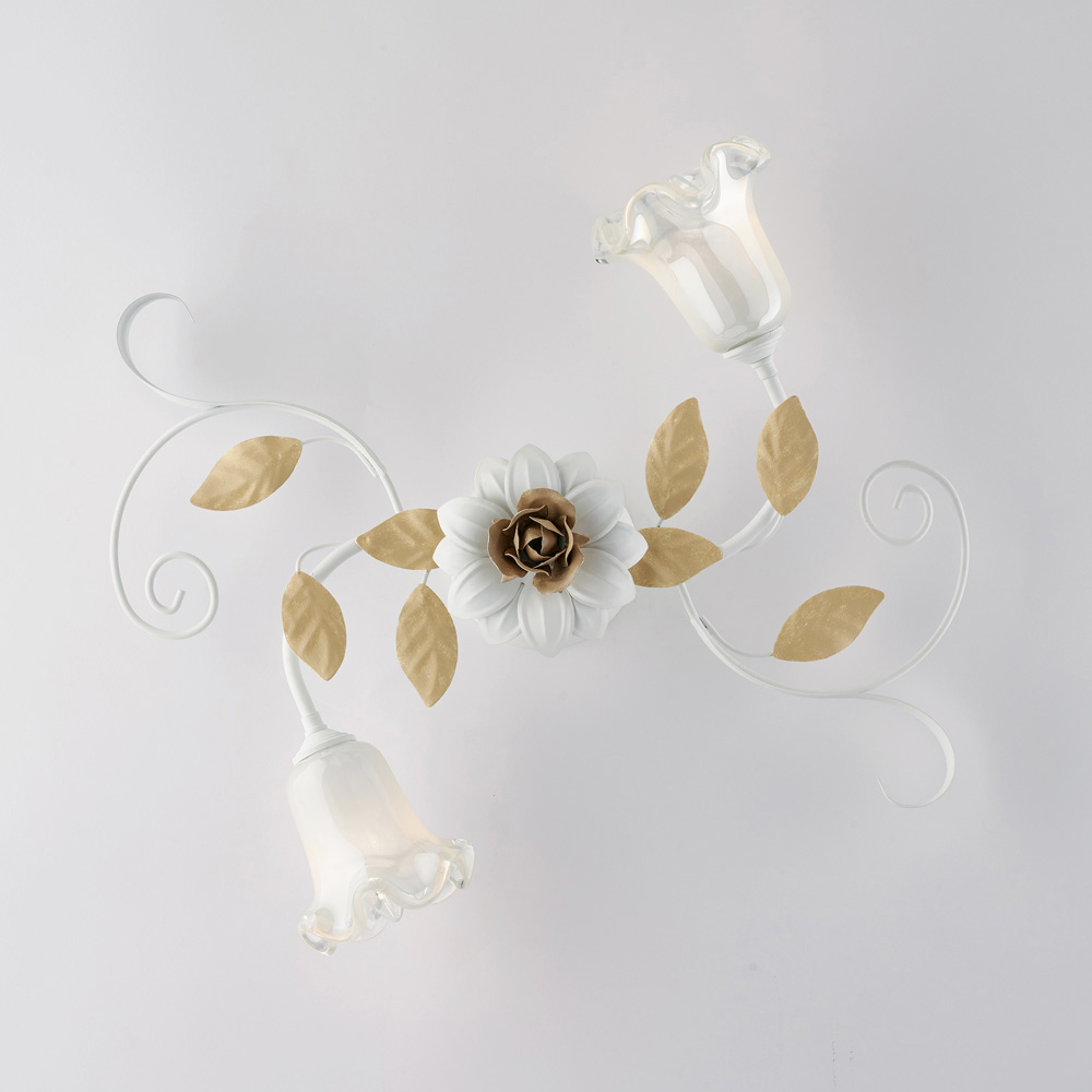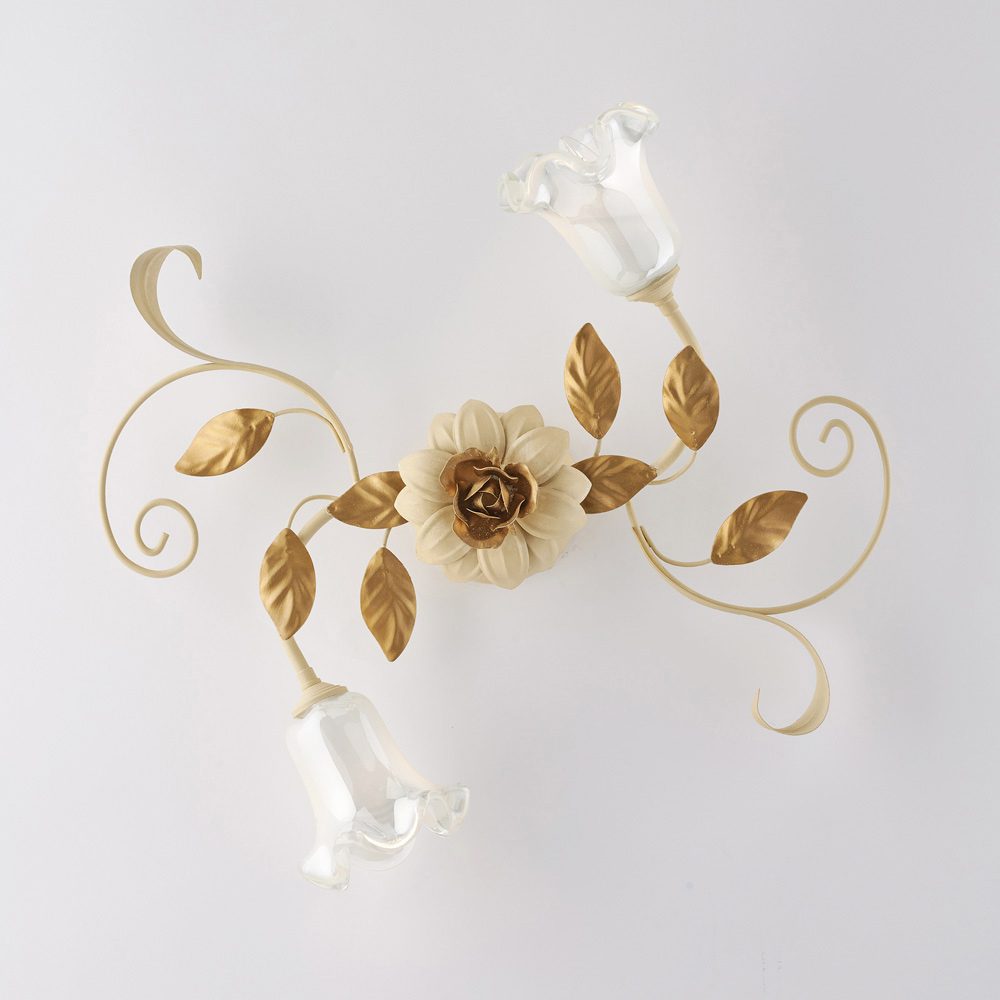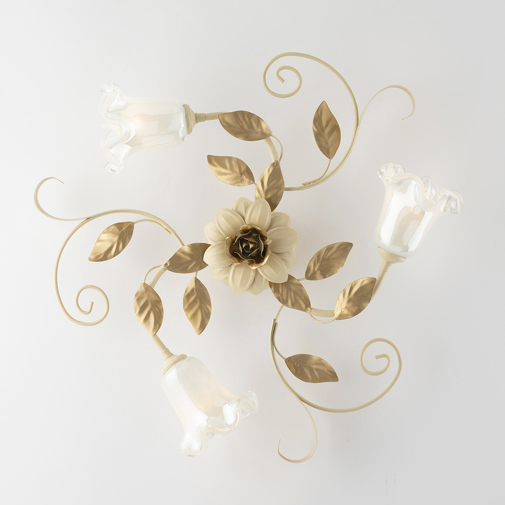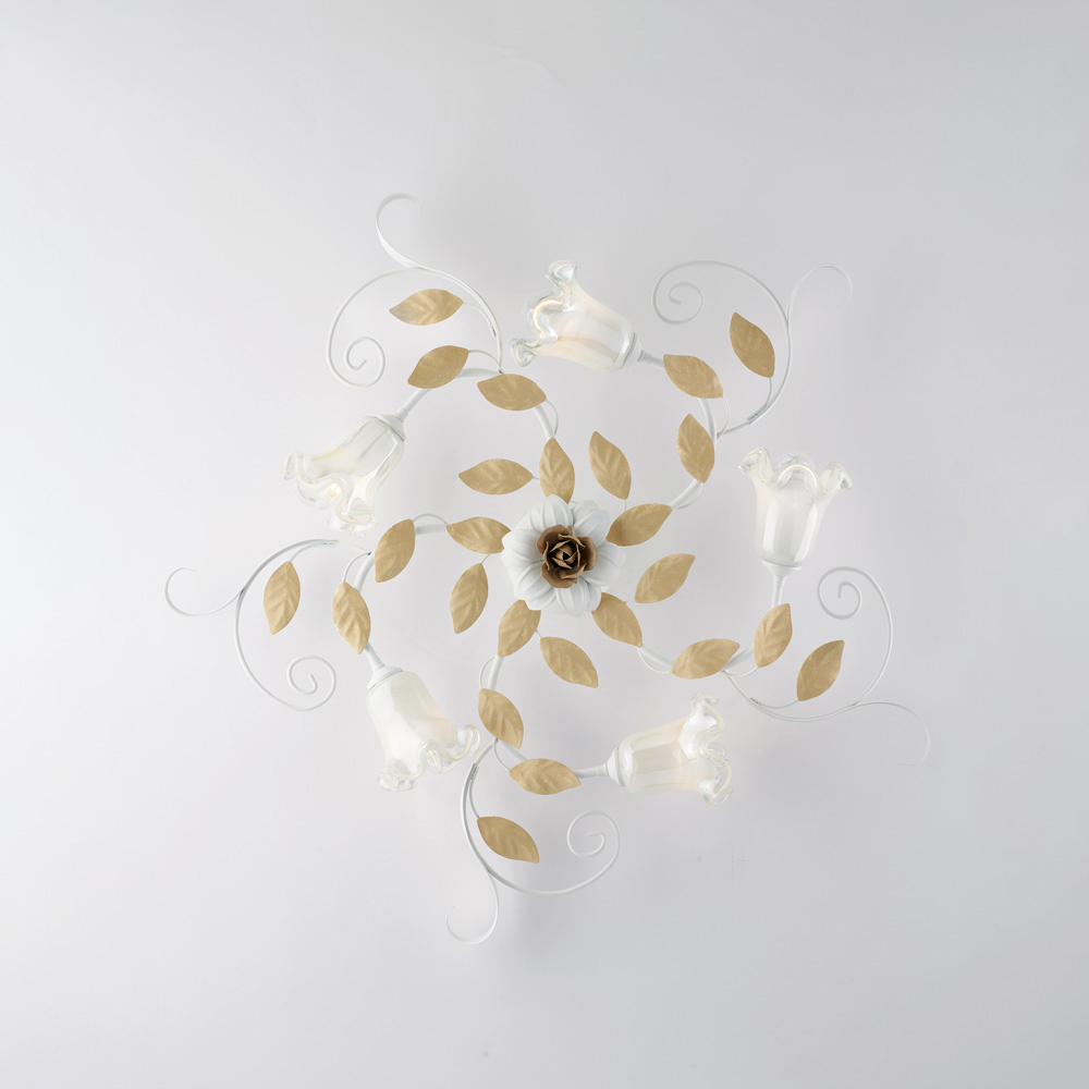 Diese elegante und dekorative, klassische Deckenleuchte aus elfenbeinfarben lackiertem Eisen besticht durch ihren romantischen Charakter. Die florale Struktur mit geschwungenen Linien, dekorativen Blättern und blütenförmigen Glasdiffusoren verleiht der Decke eine leichte und harmonische Eleganz und macht die Leuchte zu einem wahren Dekorationselement.