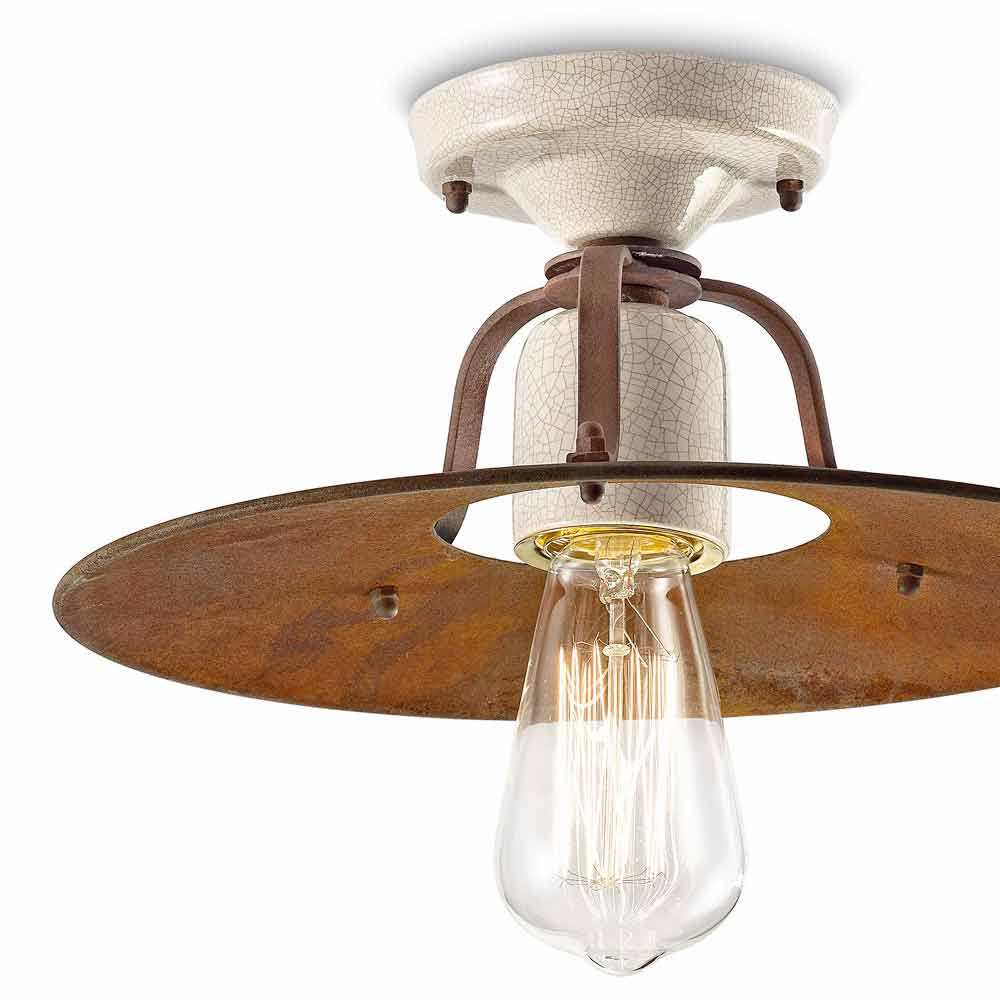 Diese schöne Deckenleuchte besteht aus einer Metallkrone in mattem Rost, während die Keramikteile, aus denen sie besteht, mit Craquelé-Details versehen sind, um ein Gleichgewicht zwischen vollen und leeren Formen zu vervollständigen. Es sind genau diese Materialien, die Elaine diese Rolle der Erinnerung an die Vergangenheit verleihen und ihren industriellen Stil vervollständigen.