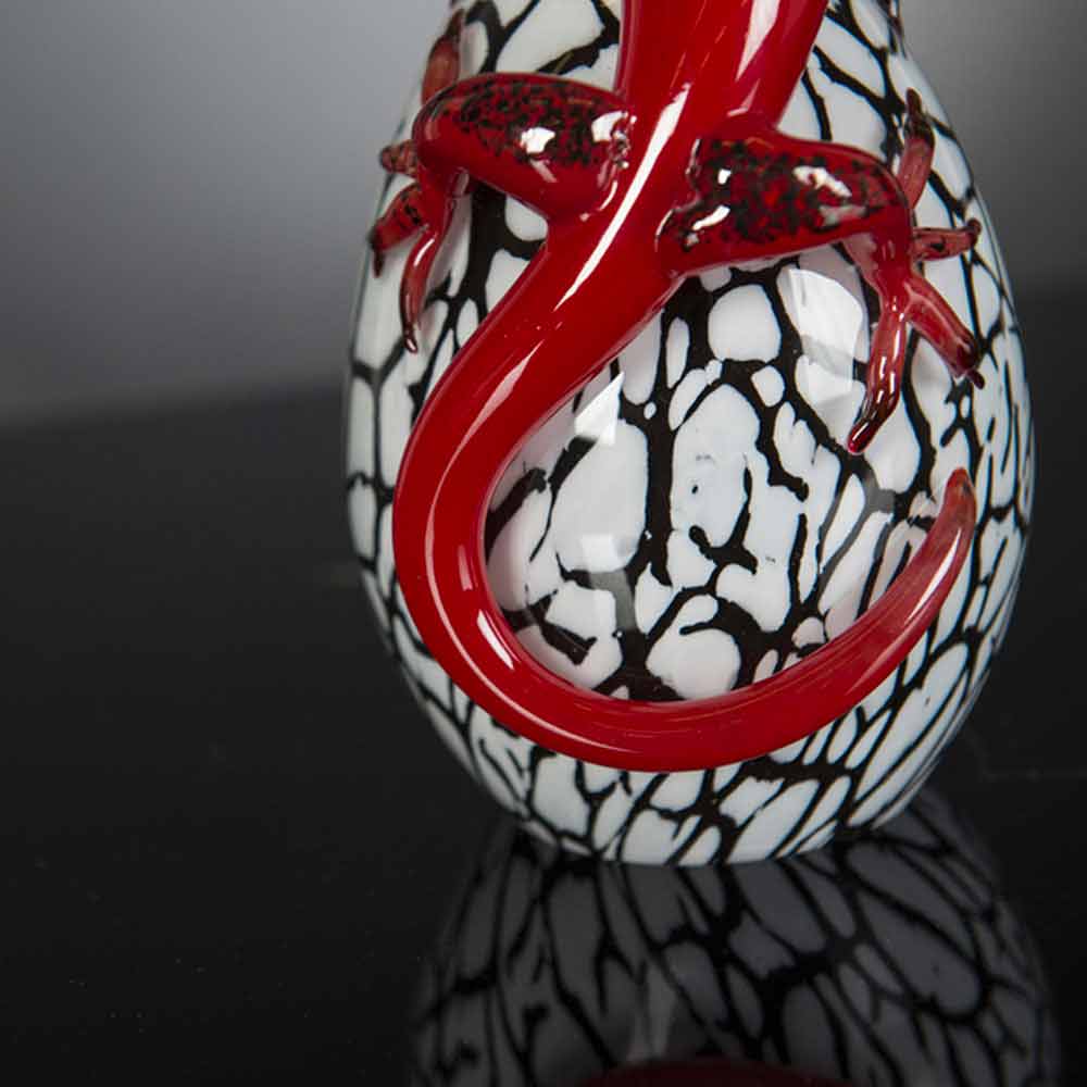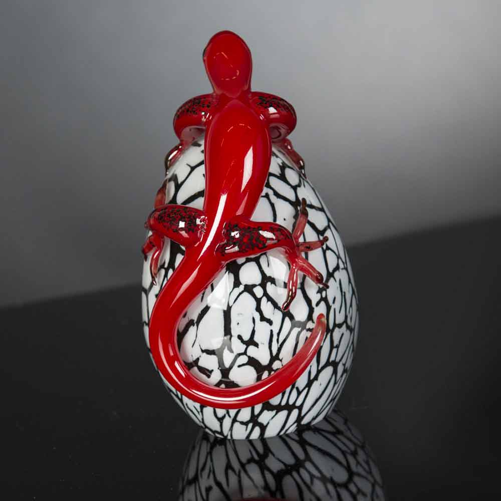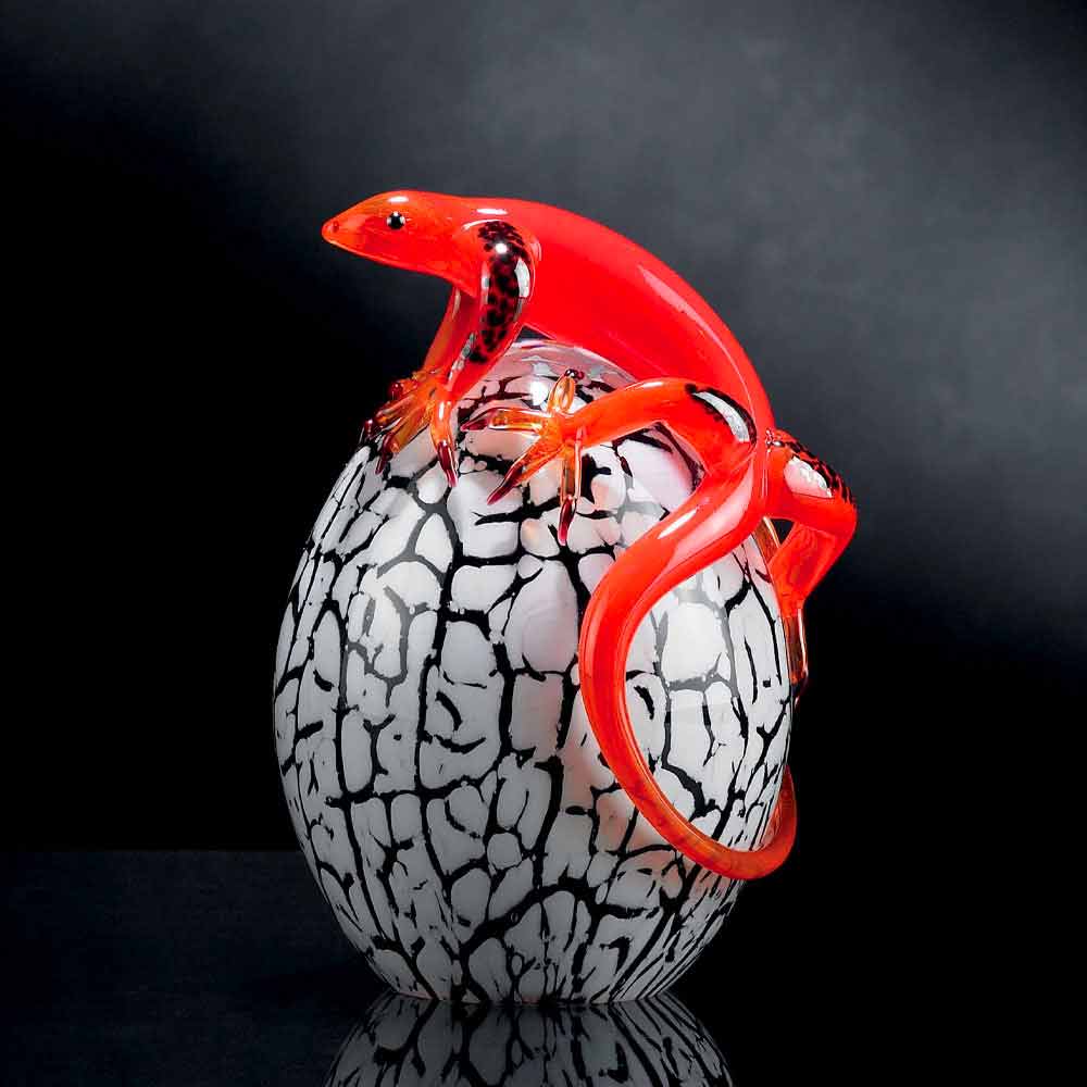 Eiförmige Statue mit Gecko made in Italy aus weißem, schwarzem und rotem Glas . Ein exzentrisches Dekorationselement für Ihre Wohnräume, das dank seiner starken kreativen Persönlichkeit eine originelle Note verleiht. Seine ungewöhnliche und farbenfrohe Ästhetik stellt zweifellos seine Stärke dar und macht es zu einer perfekten Idee für diejenigen, die es lieben, ihre Wohnumgebungen gleichzeitig auf originelle und elegante Weise zu bereichern, dank eines Objekts, das von exklusiven Linien und der zeitlosen Eleganz des Glases und . betont wird seine wunderbaren Farben. Das Ergebnis ist ein schlichtes dekoratives Accessoire für das Zuhause, das dank seiner modernen Seele und seines avantgardistischen Designs den Stil jedes Hauses mit einem Hauch von Farbe bereichern kann.