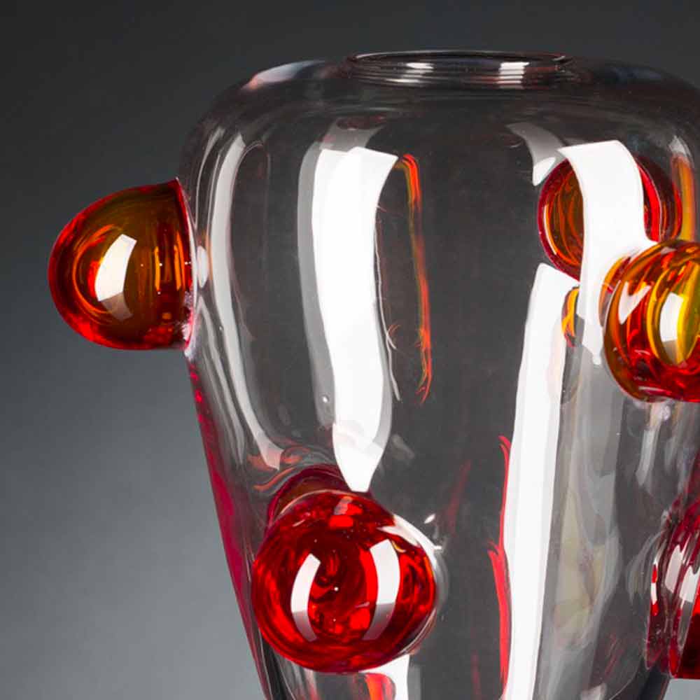 Elegante Indoor-Vase aus transparentem mundgeblasenem Muranoglas mit roten Details durch einen vollständig in Italien hergestellten Prozess . Eine Ergänzung, die die extreme Eleganz von Muranoglas und seine wunderbaren Eigenschaften mit einem modernen und lebendigen Design kombiniert, um eine Idee von exklusiven und avantgardistischen Möbeln zum Leben zu erwecken, die jeden Wohnraum bereichern können und nicht mit einem Hauch von Farbe . Ein idealer Stil für die unterschiedlichsten Umgebungen, von der Wohnungseinrichtung bis hin zu Hotels, Restaurants, Objektbereichen, Spas, aber auch als Rahmen für Veranstaltungen und Hochzeiten.