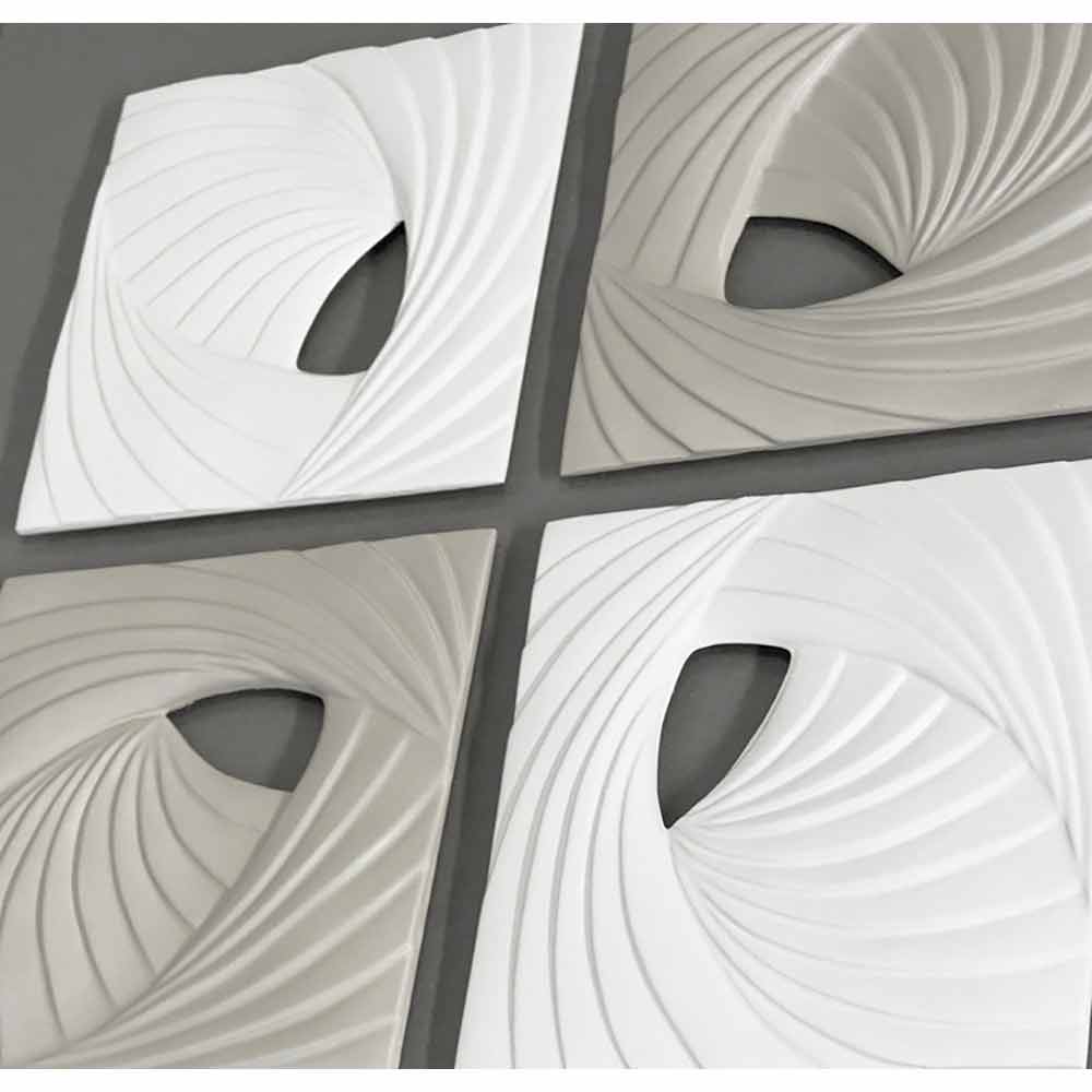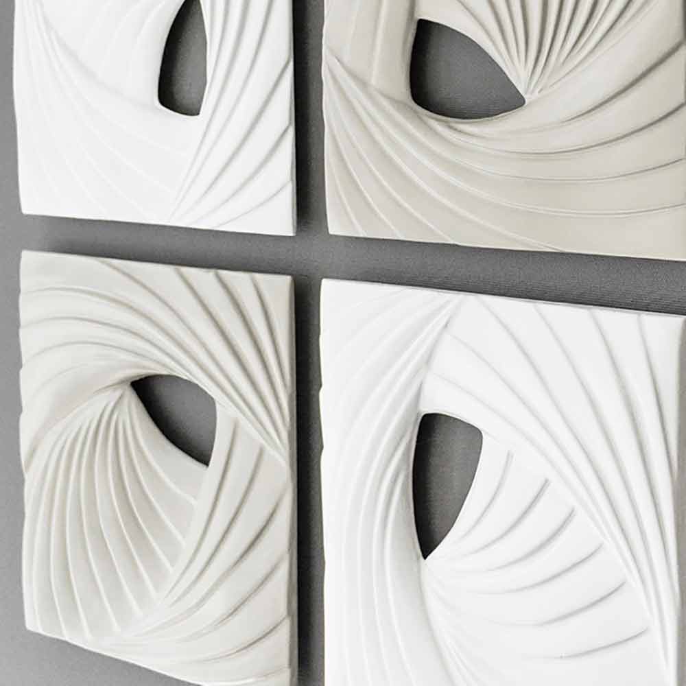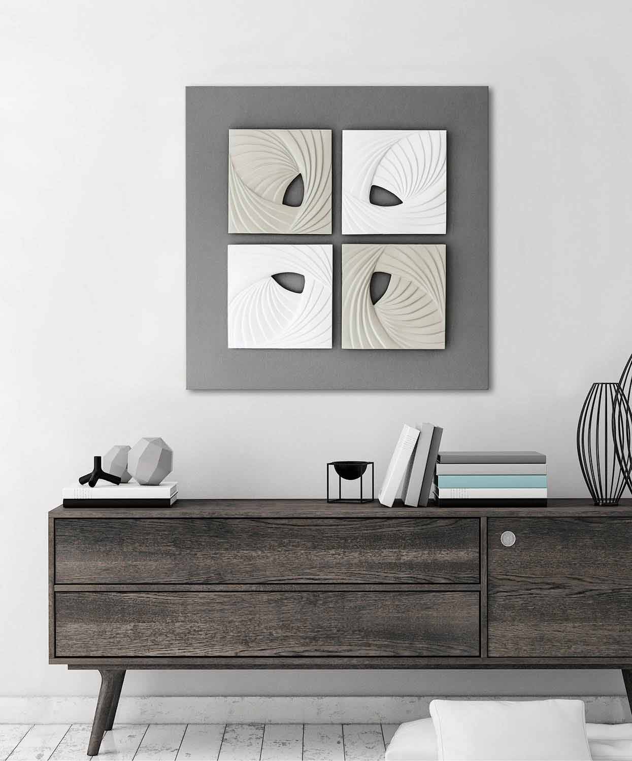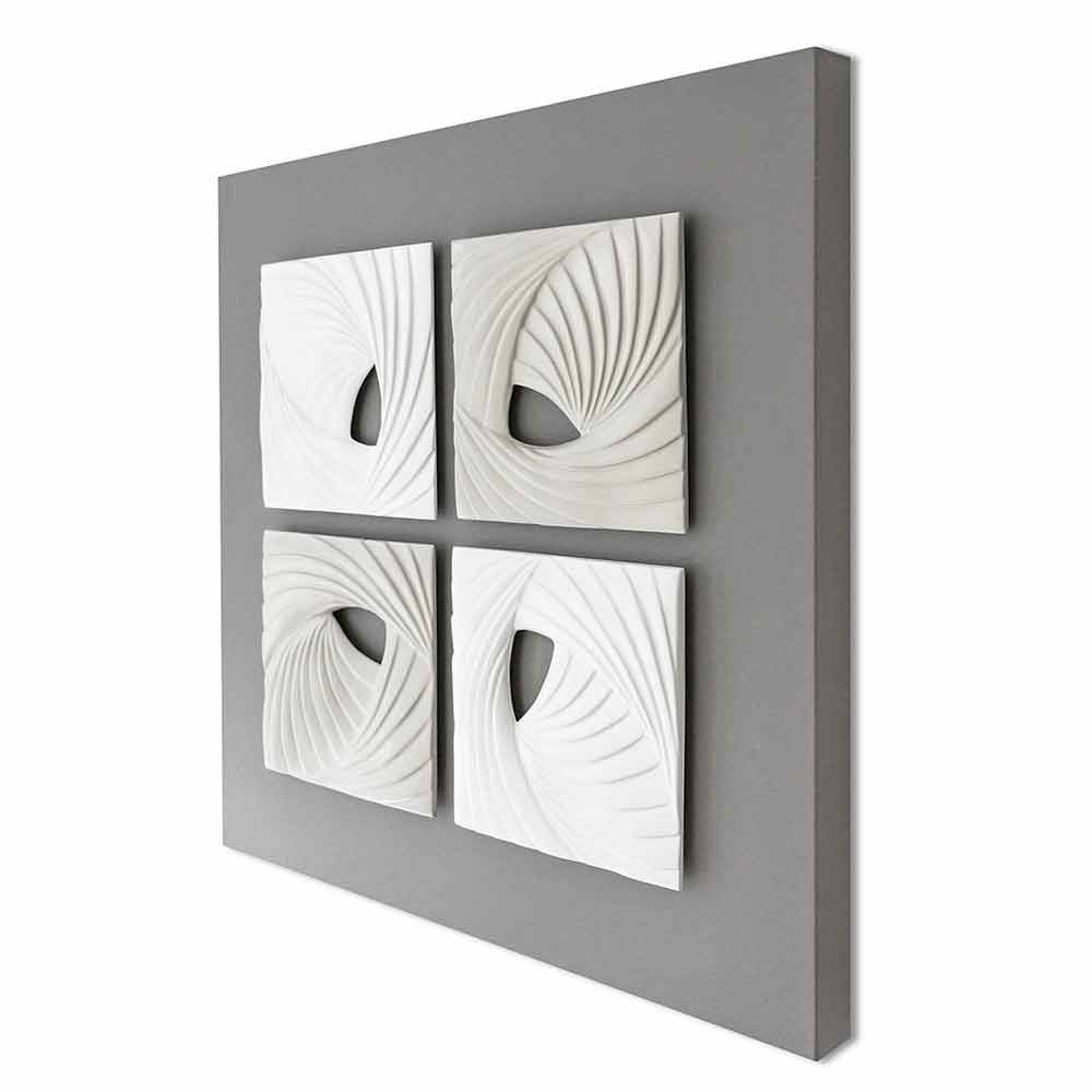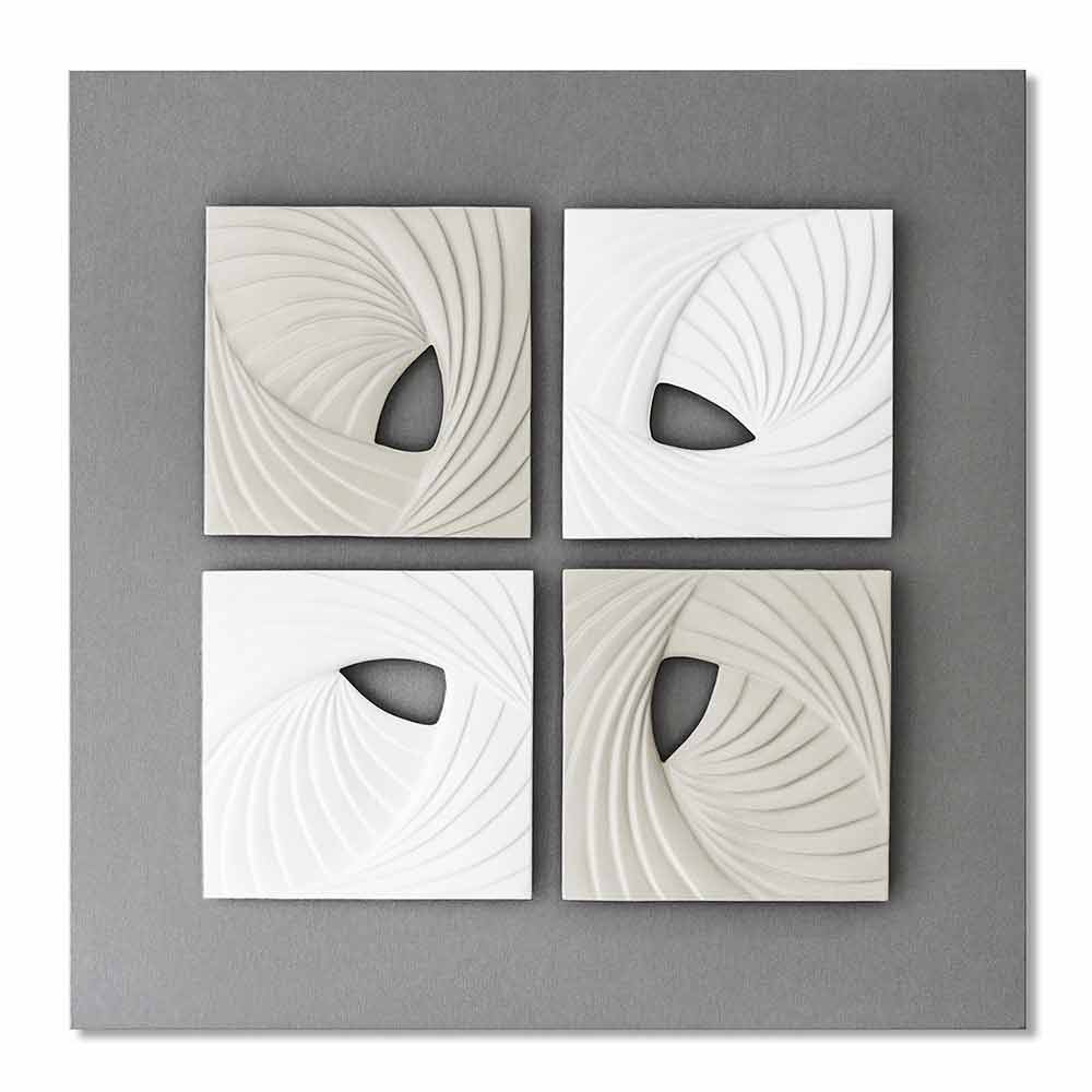 Wandmontage in Verbundkeramik besteht aus vier Elementen mit eleganten Linien und modernen Formen in Elfenbein weiß und grau Seide montiert steingrau lackiert Leinwand überhängend auf. Das Ergebnis ist eine minimale und dekorative ästhetische Wirkung für einen einzigartigen Stil.