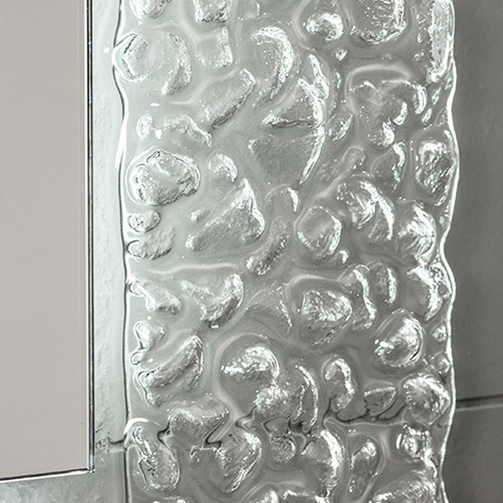 Dieser Wandspiegel zeichnet sich durch den dekorativen und raffinierten 15 cm transparenten geschmolzenen verzierten Glasrahmen aus, der der Ergänzung und der Umgebung ein schickes und äußerst elegantes Aussehen verleiht.