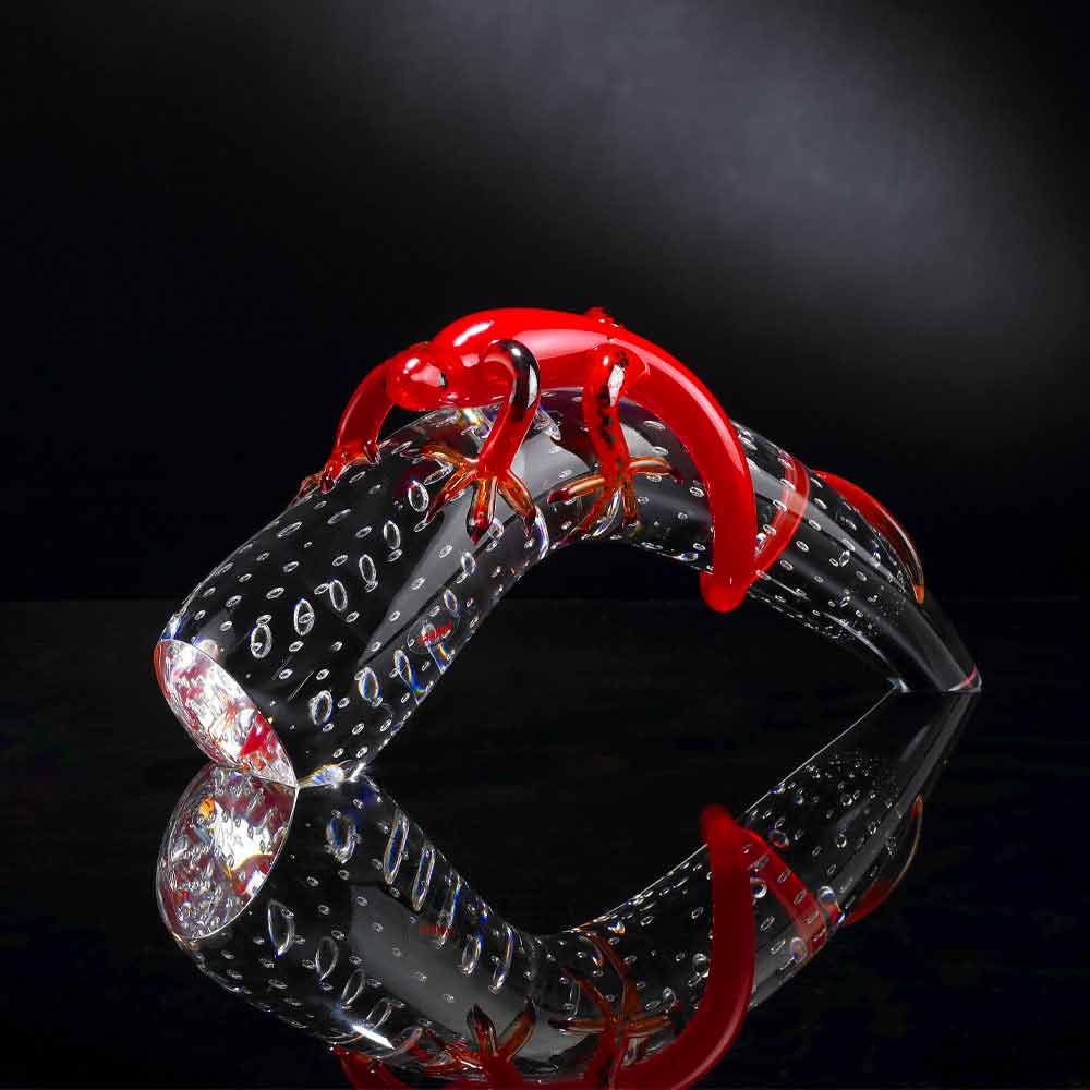 Ornament in Form eines Geckos auf einem Horn made in Italy aus rotem und transparentem Glas . Ein exzentrisches Dekorationselement für Ihre Wohnräume, das dank seiner starken kreativen Persönlichkeit eine originelle Note verleiht. Seine ungewöhnliche und farbenfrohe Ästhetik stellt zweifellos seine Stärke dar und macht es zu einer perfekten Idee für diejenigen, die es lieben, ihre Wohnumgebungen gleichzeitig auf originelle und elegante Weise zu bereichern, dank eines Objekts, das von exklusiven Linien und der zeitlosen Eleganz des Glases und . betont wird seine wunderbaren Farben. Das Ergebnis ist ein schlichtes dekoratives Accessoire für das Zuhause, das dank seiner modernen Seele und seines avantgardistischen Designs den Stil jedes Hauses mit einem Hauch von Farbe bereichern kann.