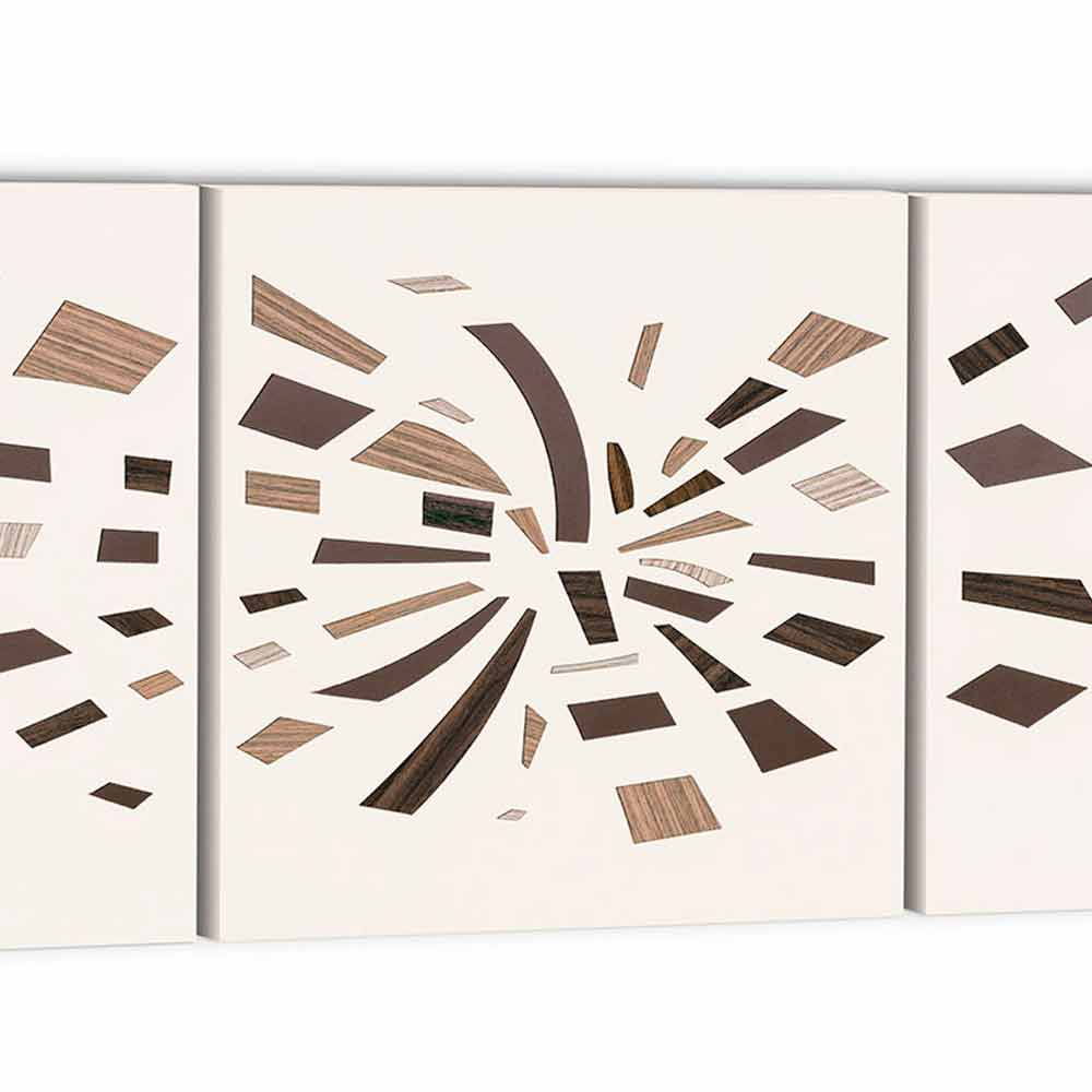 Laminat- und Ton-in-Ton-Holzapplikationen bereichert wird, die sich durch verschiedene Essenzen und Farbnuancen auszeichnen. Drei miteinander verbundene Paneele ergeben ein Ergebnis mit einem wunderbar ausgewogenen Design sowie der besonderen Textur und den besonderen Farben, die es zu einem echten Kunstwerk machen, eine perfekte Ergänzung für Umgebungen mit einer starken