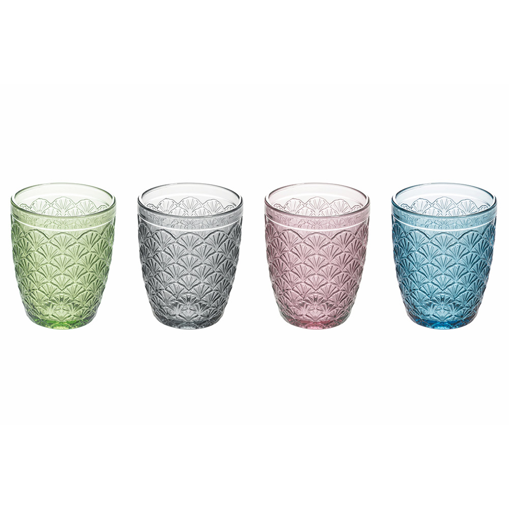 Set Wassergläser aus farbigem Glas und Blattdekor, 12-teilig.