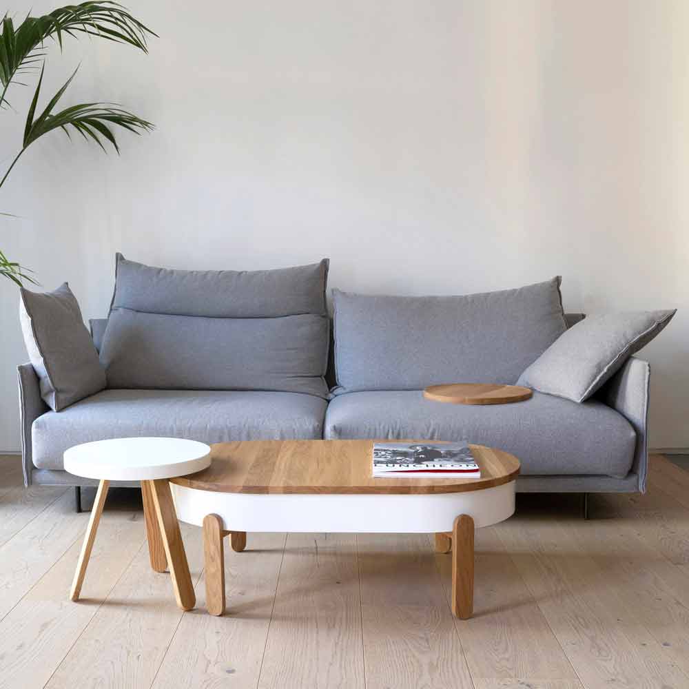Moderner Couchtisch aus massiver Eiche und lackiertem Stahl.