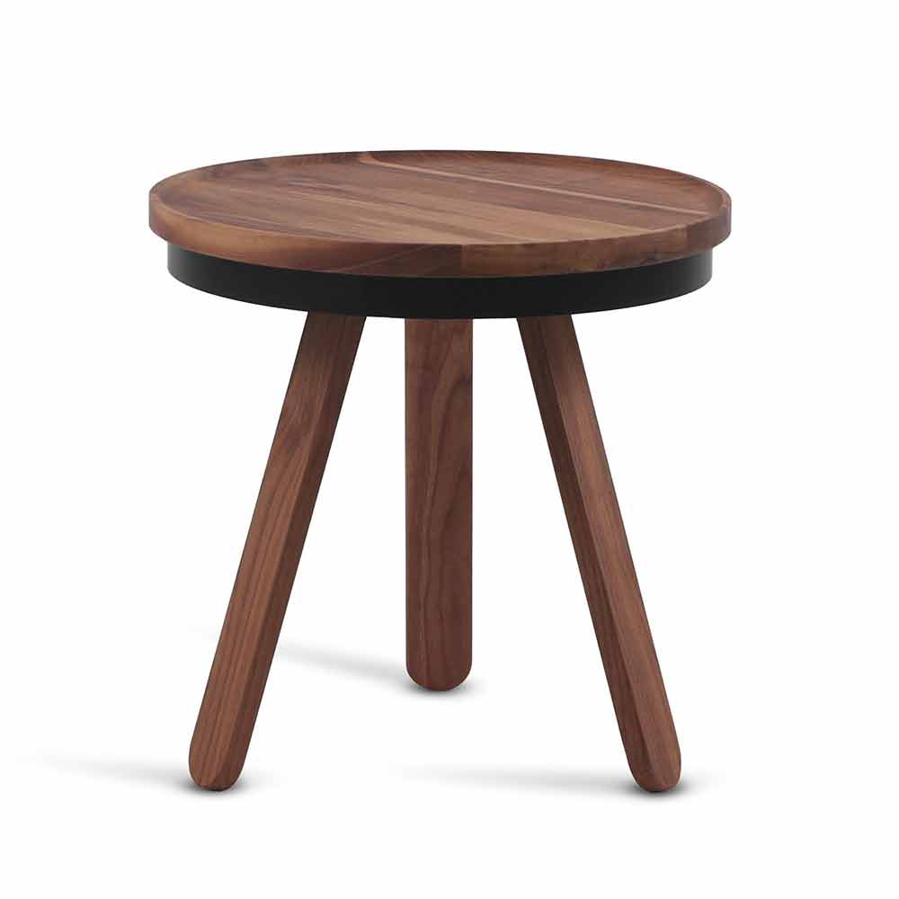 Couchtisch aus Massivholz und Stahl mit runder Platte.
