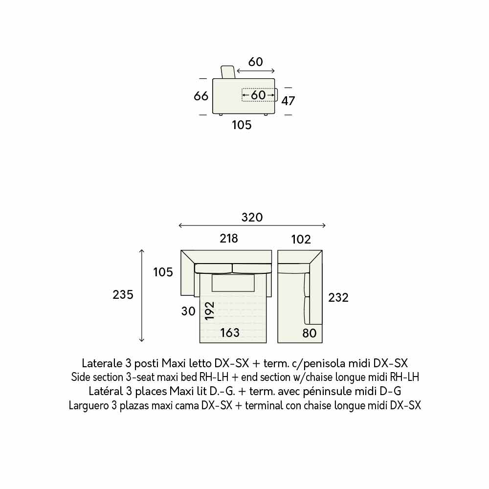 - L 320 x P 235 x H 85 cm (Matratze: L 163 x P 192 x H 11 cm).