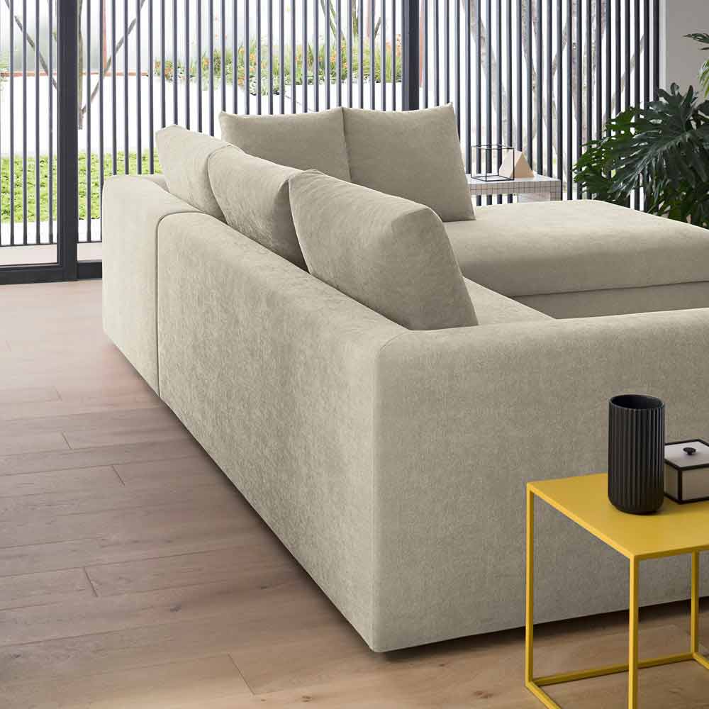 Sofa in Familiengröße, das durch die große Chaiselongue bereichert wird und idealen Komfort bietet, um wundervolle Abende mit Freunden zu genießen oder sich von der warmen und weichen Umarmung seines einladenden Designs verwöhnen zu lassen. Dieses Sofa ist schnell und einfach zuzubereiten und verwandelt sich in ein