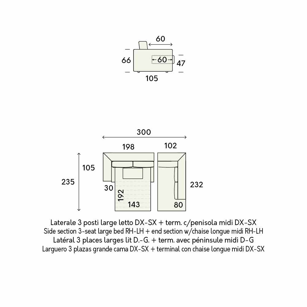 - L 300 x P 235 x H 85 cm (Matratze: L 143 x P 192 x H 11 cm):
