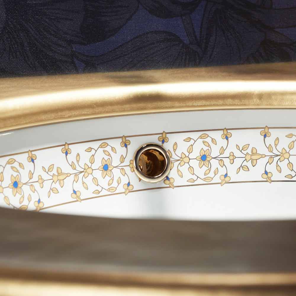Einbauwaschbecken komplett in Italien realisiert handgefertigt aus Fire Clay mit Rand Blumendeko blau und 24 Karat Gold.
