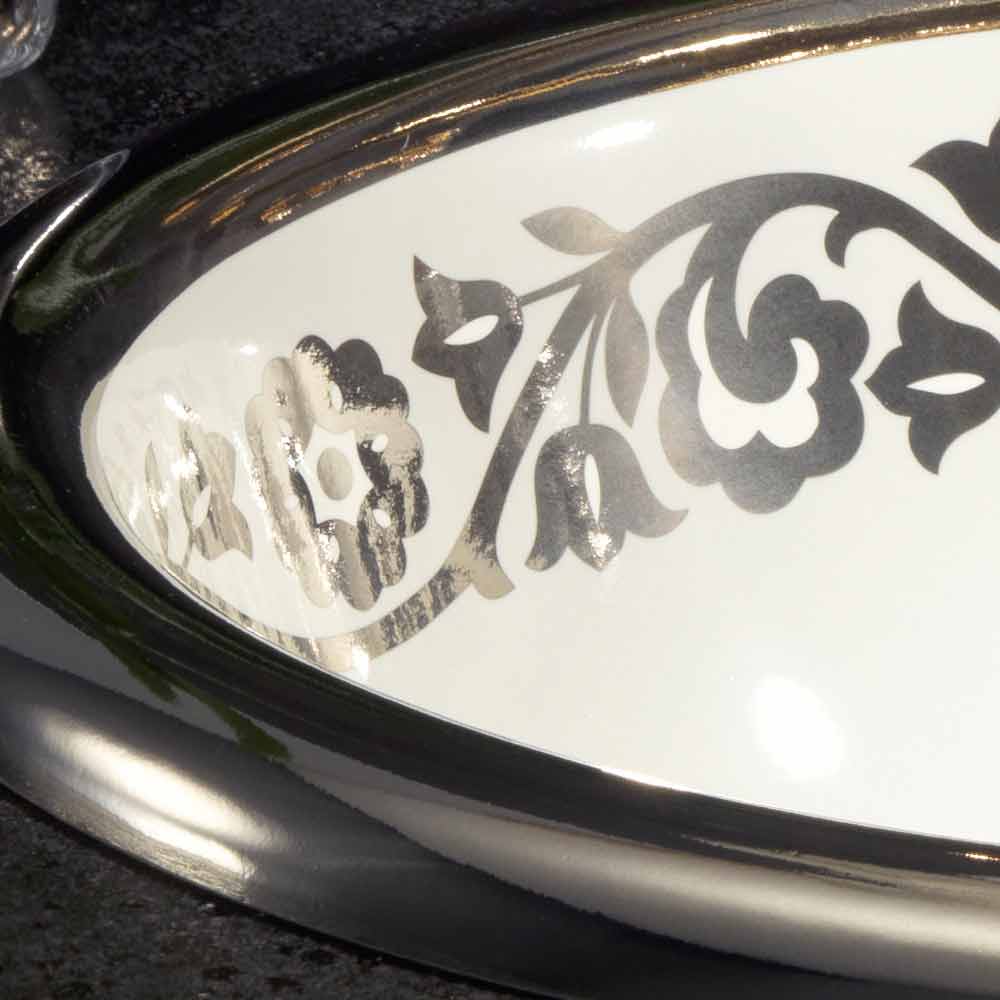 Einbauwaschbecken made in Italy aus handgefertigtem Fire Clay, verziert mit platinfarbenem Blumenband und platinfarbenem handbemaltem Rand.