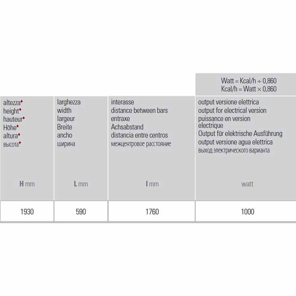 Maße H 1820 + 110 Thermostat x L 590 x Inter. 1760 mm x Ausgang w (Δt50 °) 839