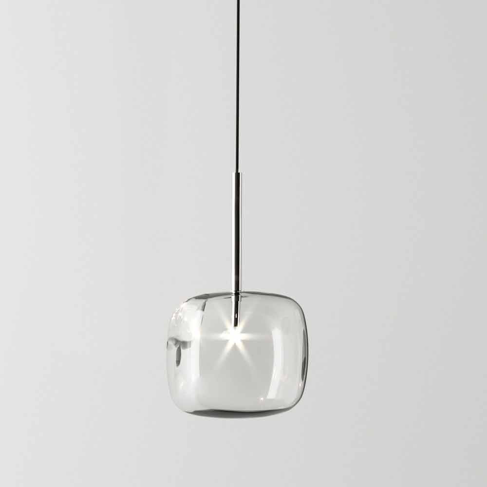 Design Pendelleuchte aus poliertem Metall mit abgerundetem Glaswürfel Made in Italy.