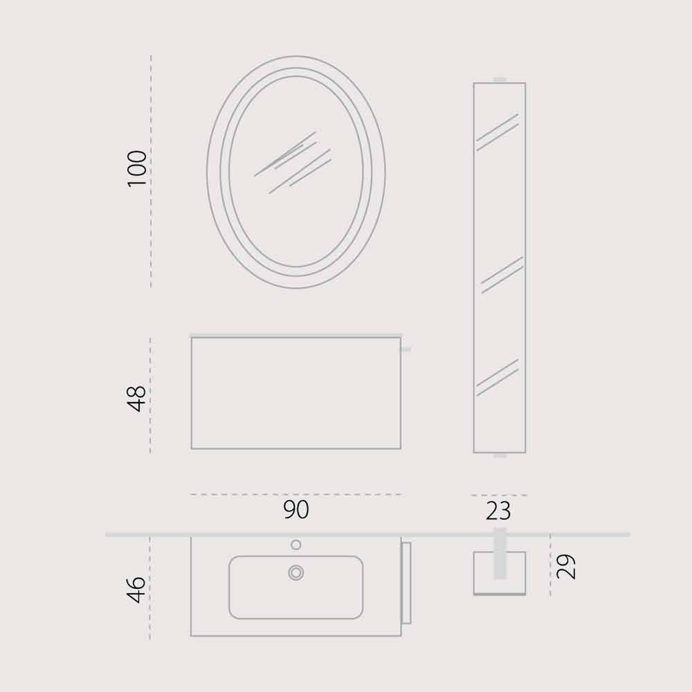 - ein Waschbeckenunterteil aus matt toupe lackiertem MDF mit glänzend verchromtem Griff; L90xH48xP46cm;