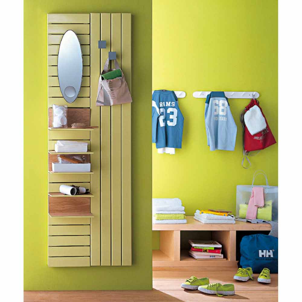 Hydraulischer Heizkörper, praktisch und funktional mit linearem Design, heizt und organisiert jede Umgebung, in die er eingebaut wird. Vertikaler Heizkörper aus farbigem Stahl, komplett mit Regalen (wie auf dem Foto gezeigt) mit Rückenlehnenregalen und Oberseite aus natürlicher Eiche.