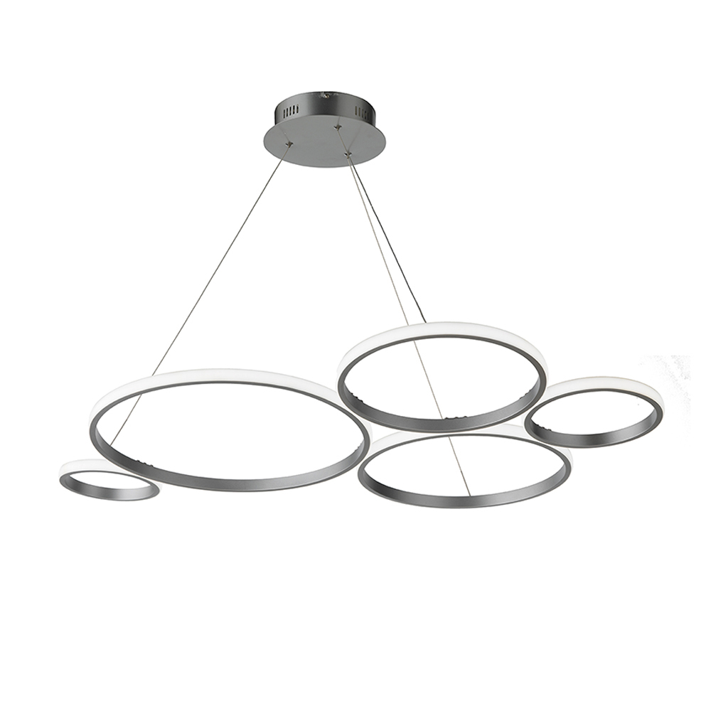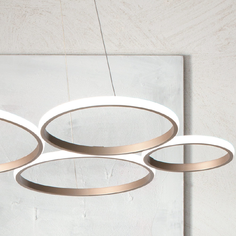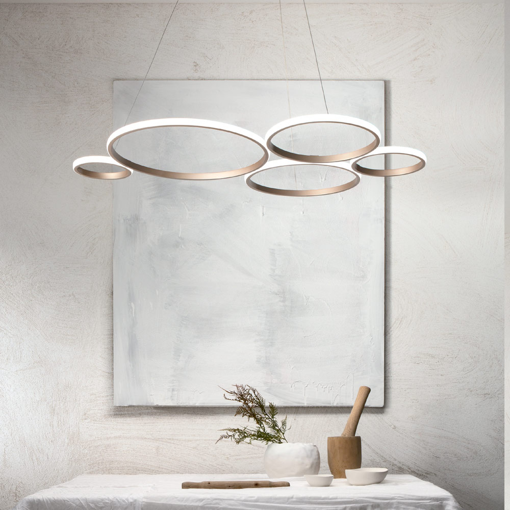 Pendelleuchte für das Wohnzimmer mit elegantem Design aus gold- oder silberfarben lackiertem Metall.