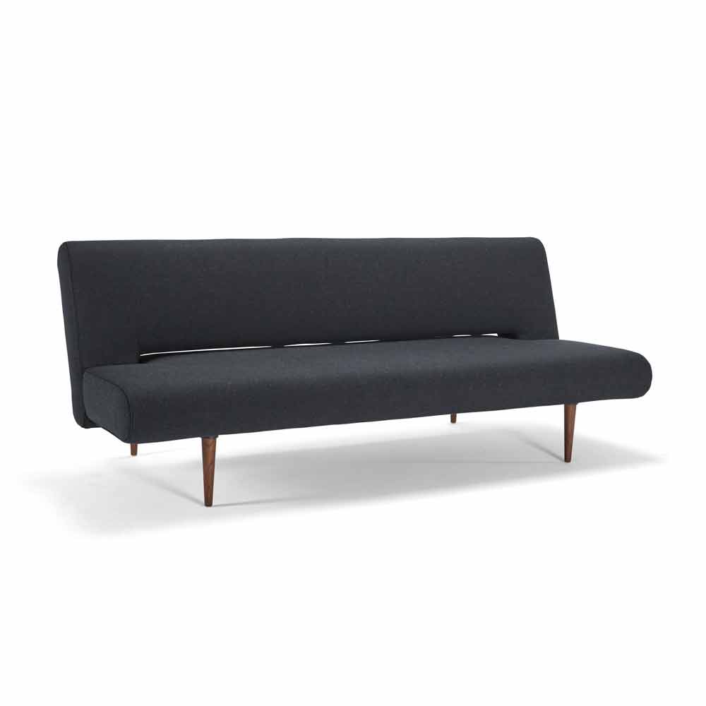Unfurl ist das Schlafsofa mit einer mattschwarzen Stahlstruktur und dunkel gebeizten Holzbeinen.