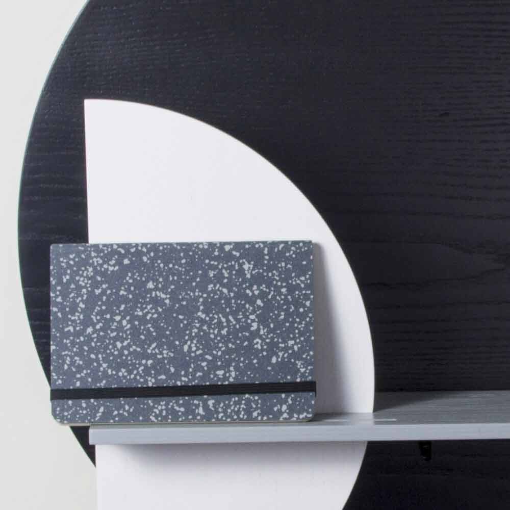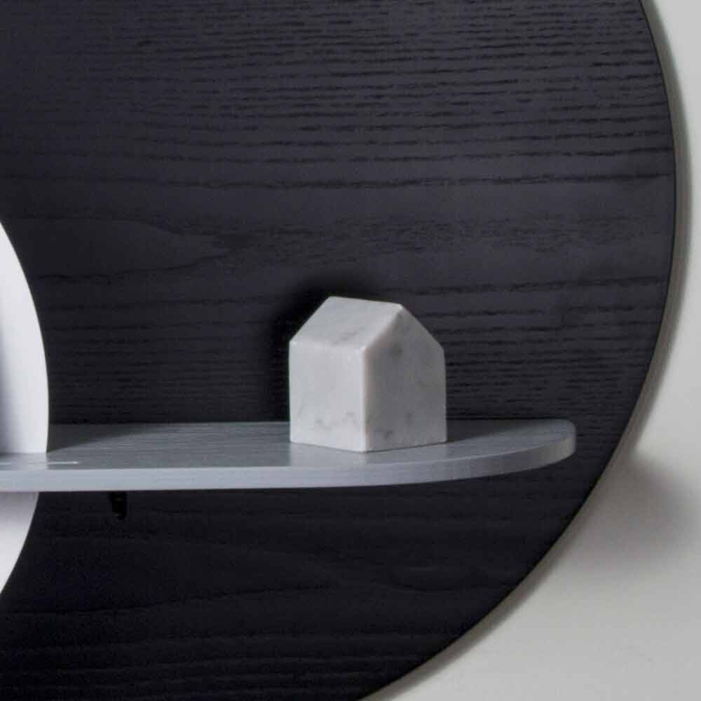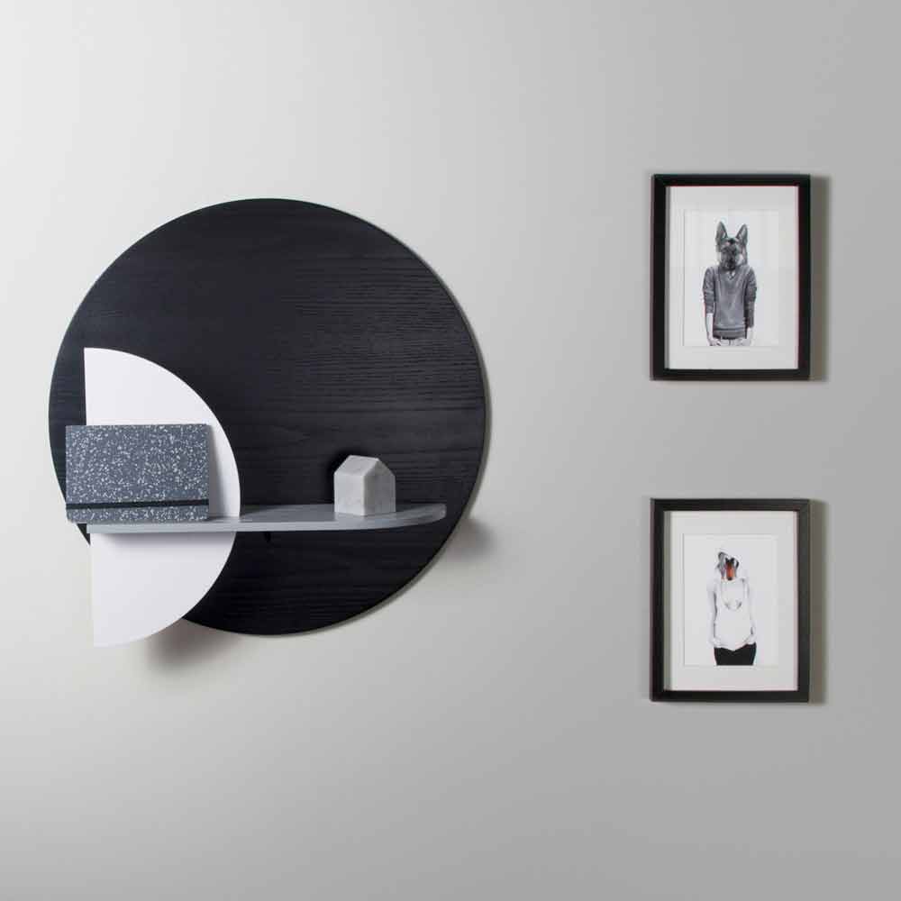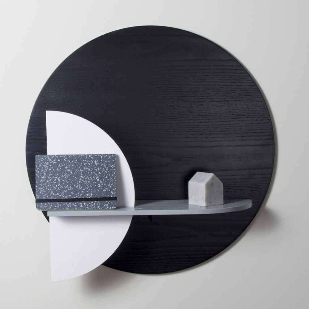 Seine Struktur besteht aus 3 Platten unterschiedlicher Formen aus weiß, schwarz und grau gebeizt ash Sperrholz, von denen einer an der Wand angebracht ist, die die reale Trägerfläche und zwei vertikale Platten , die Bewegung und Harmonie geben darstellt. Die Besonderheit dieses Regals ist die Möglichkeit, das Produkt anzupassen, indem die 2 vertikalen Paneele kombiniert werden, mit denen Sie je nach Geschmack und Bedarf zwischen 8 verschiedenen Konfigurationen wählen können.